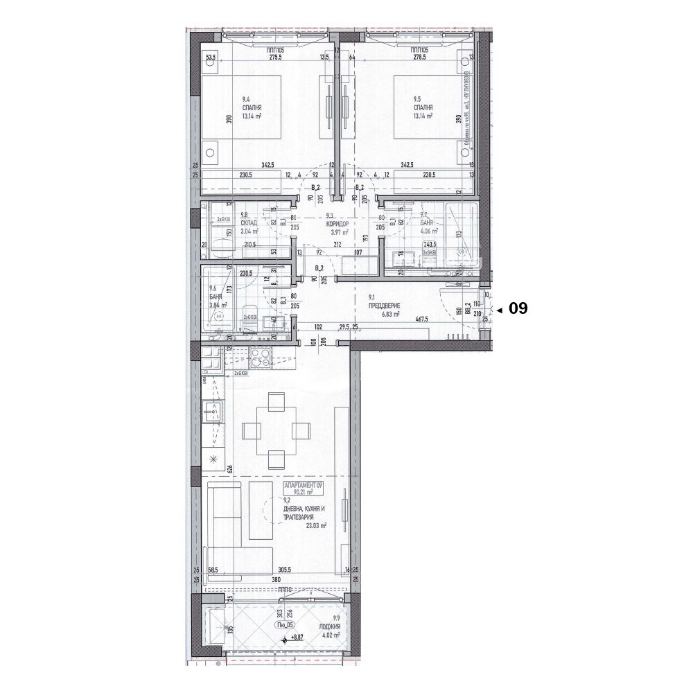 дневна с бокс, две бани с wc, килер, тераса, две спални.