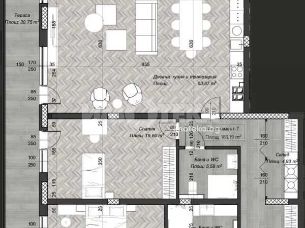 Тристаен апартамент с източно изложение, състоящ се от антре, просторна дневна с кухненски бокс, две спални, складово помещение, две бани с тоалетна и панорамна тераса. Жилището е разположено в елегантна и престижна сграда в центъра на София, съчетаваща модерна архитектура с изчистен дизайн и впечатляващо фасадно остъкляване, което осигурява простор и светлина. Намира се на комуникативно място с удобен достъп до подземен и надземен паркинг, в непосредствена близост до ключови транспортни връзки и удобства.