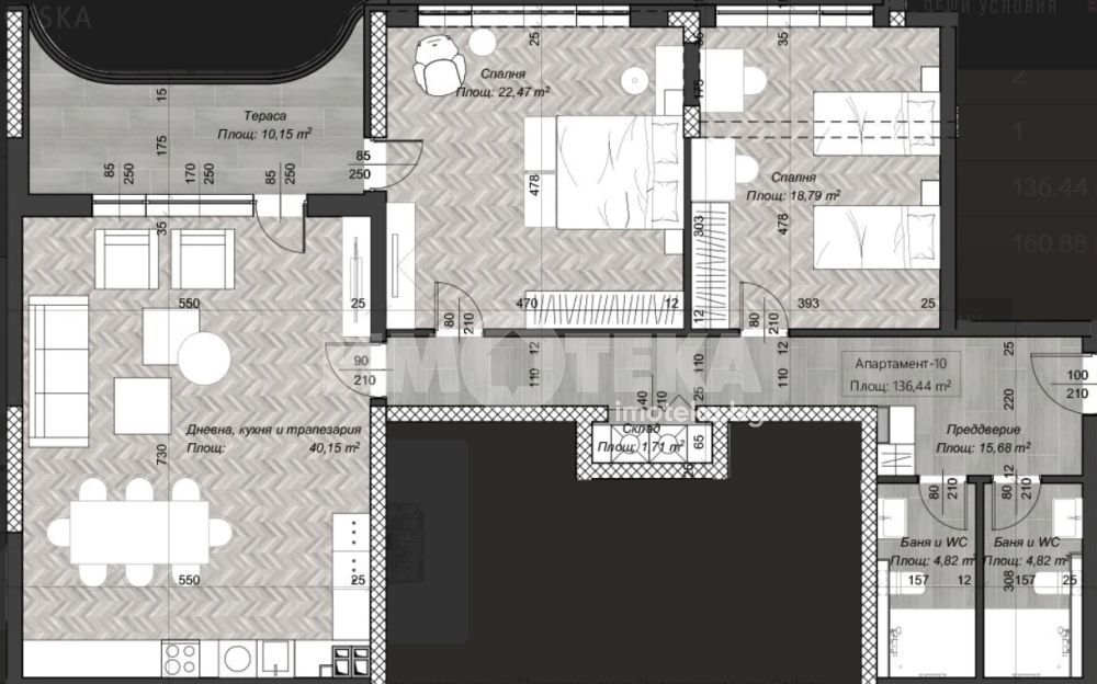 Тристаен апартамент с източно изложение, състоящ се от антре, просторна дневна с кухненски бокс, две спални, складово помещение, две бани с тоалетна и тераса. Жилището е разположено в елегантна и престижна сграда в центъра на София, съчетаваща модерна архитектура с изчистен дизайн и впечатляващо фасадно остъкляване, което осигурява простор и светлина. Намира се на комуникативно място с удобен достъп до подземен и надземен паркинг, в непосредствена близост до ключови транспортни връзки и удобства.
