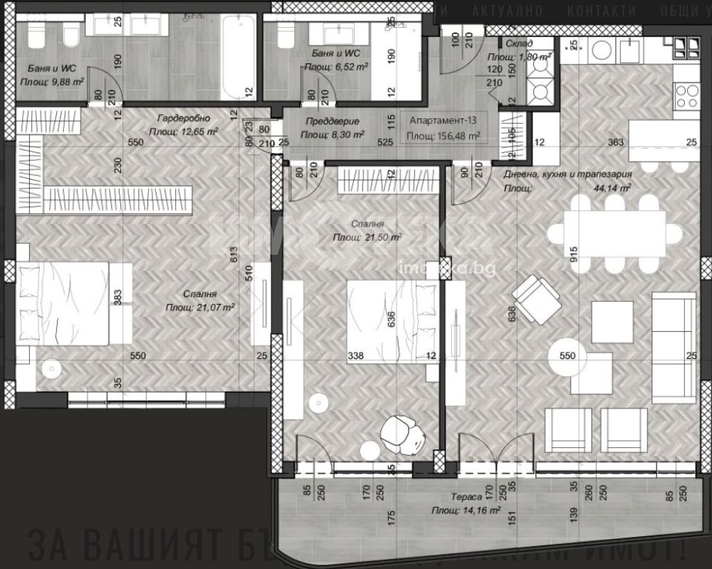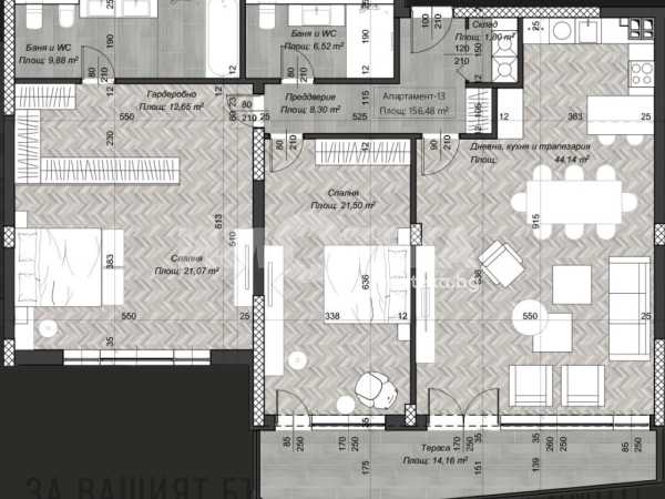 Тристаен апартамент със западно изложение, състоящ се от антре, просторна дневна с кухненски бокс, две спални - едната от които е със собствен дрешник, складово помещение, две бани с тоалетна и тераса. Жилището е разположено в елегантна и престижна сграда в центъра на София, съчетаваща модерна архитектура с изчистен дизайн и впечатляващо фасадно остъкляване, което осигурява простор и светлина. Намира се на комуникативно място с удобен достъп до подземен и надземен паркинг, в непосредствена близост до ключови транспортни връзки и удобства.