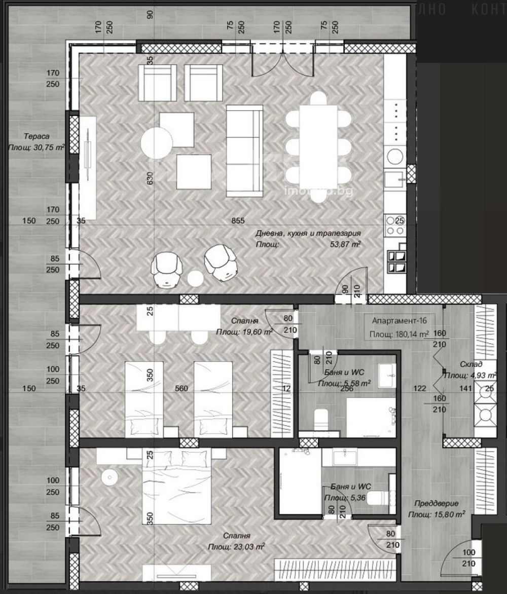 Тристаен апартамент с източно изложение, състоящ се от антре, просторна дневна с кухненски бокс, две спални, складово помещение, две бани с тоалетна и панорамна тераса. Жилището е разположено в елегантна и престижна сграда в центъра на София, съчетаваща модерна архитектура с изчистен дизайн и впечатляващо фасадно остъкляване, което осигурява простор и светлина. Намира се на комуникативно място с удобен достъп до подземен и надземен паркинг, в непосредствена близост до ключови транспортни връзки и удобства.