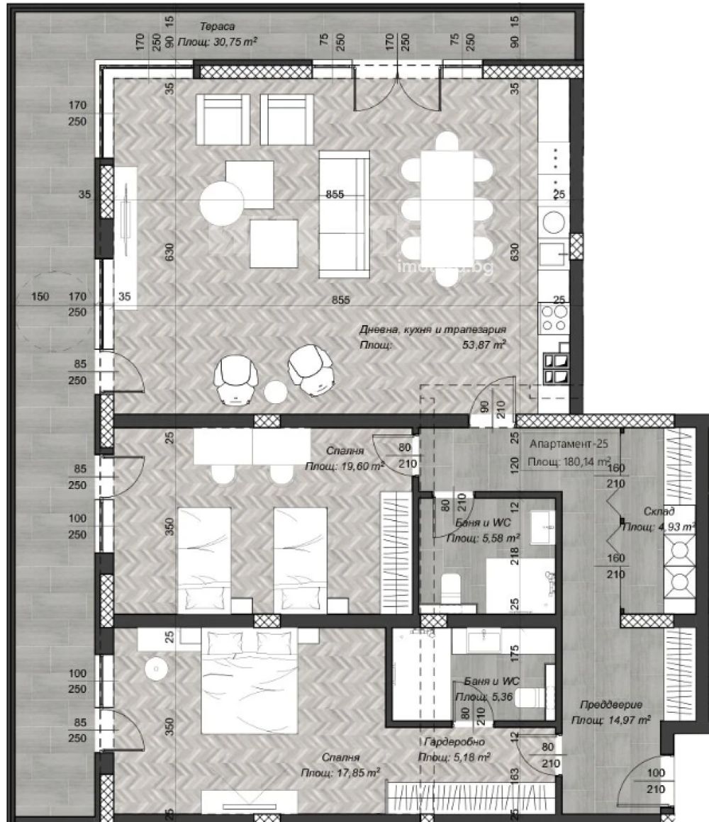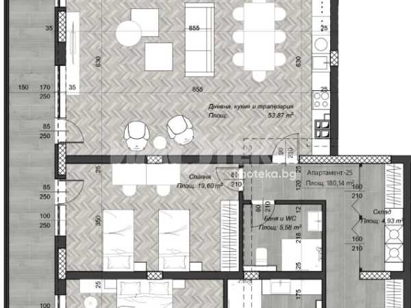 Тристаен апартамент с източно изложение, състоящ се от антре, просторна дневна с кухненски бокс, две спални, дрешник, складово помещение, две бани с тоалетна и панорамна тераса. Жилището е разположено в елегантна и престижна сграда в центъра на София, съчетаваща модерна архитектура с изчистен дизайн и впечатляващо фасадно остъкляване, което осигурява простор и светлина. Намира се на комуникативно място с удобен достъп до подземен и надземен паркинг, в непосредствена близост до ключови транспортни връзки и удобства.