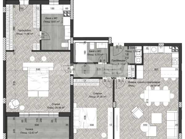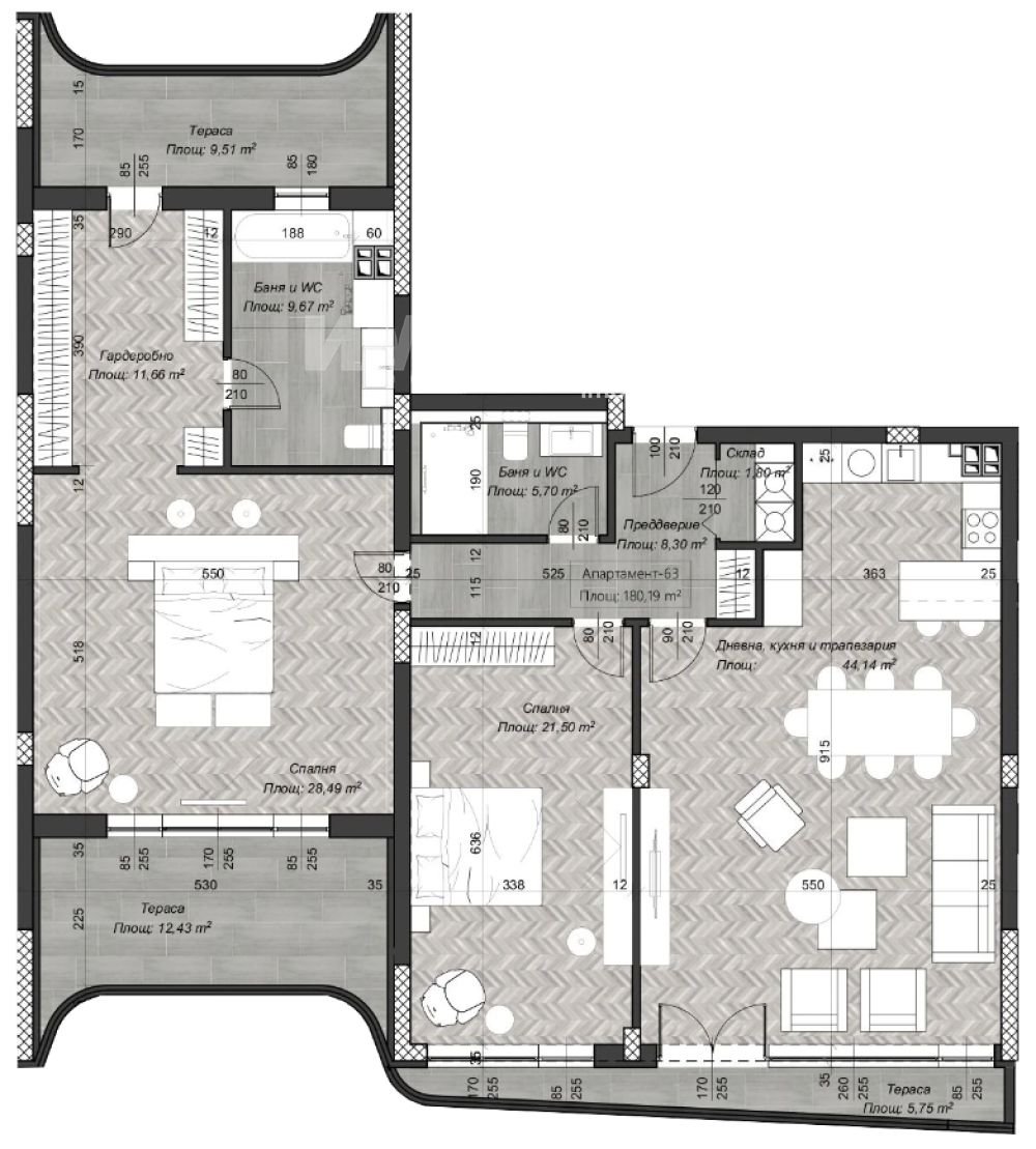 Тристаен апартамент на две изложения - изток/запад, състоящ се от антре, просторна дневна с кухненски бокс и трапезария, две спални, с възможност за обособяване на трета спалня, складово помещение, две бани с тоалетна и три тераси. Жилището е разположено в елегантна и престижна сграда в центъра на София, съчетаваща модерна архитектура с изчистен дизайн и впечатляващо фасадно остъкляване, което осигурява простор и светлина. Намира се на комуникативно място с удобен достъп до подземен и надземен паркинг, в непосредствена близост до ключови транспортни връзки и удобства.