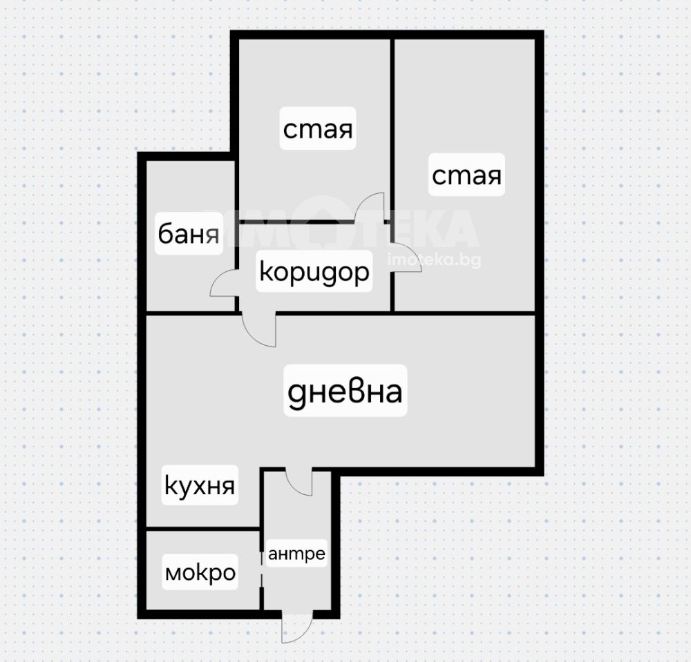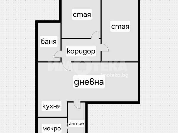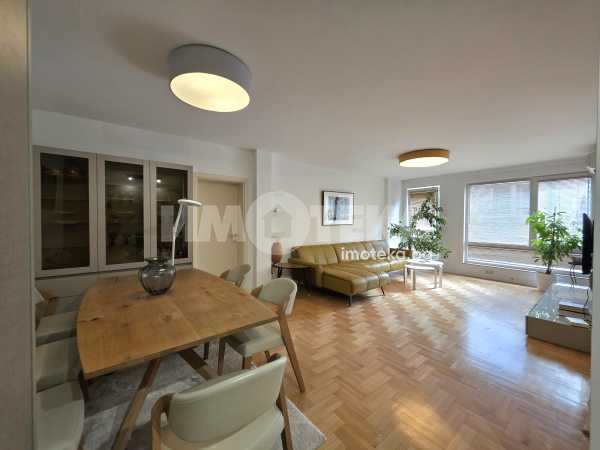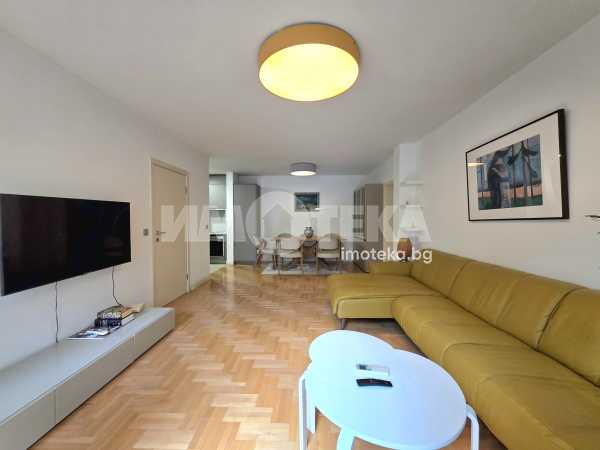 Тристаен апартамент със следното разпределение: просторна всекидневна с кухненски бокс и трапезария, две спални, баня с тоалетна, складово помещение, мокро помещение и коридор. Жилището е в отлично състояние и напълно обзаведено. Изложението е юг и запад.