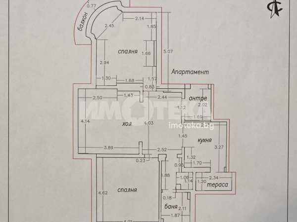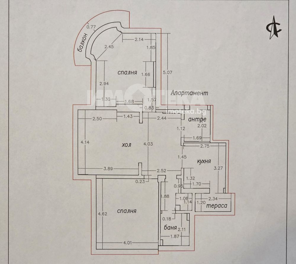 Антре, вестибюл (трапезария), слънчев хол, две просторни спални от 19 и 20 кв.м., балкон, втори балкон - усвоен, кухня, мокро помещение, баня с тоалетна, отделна тоалетна, коридор.