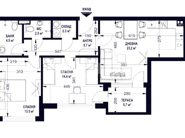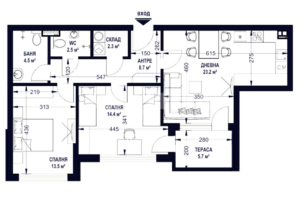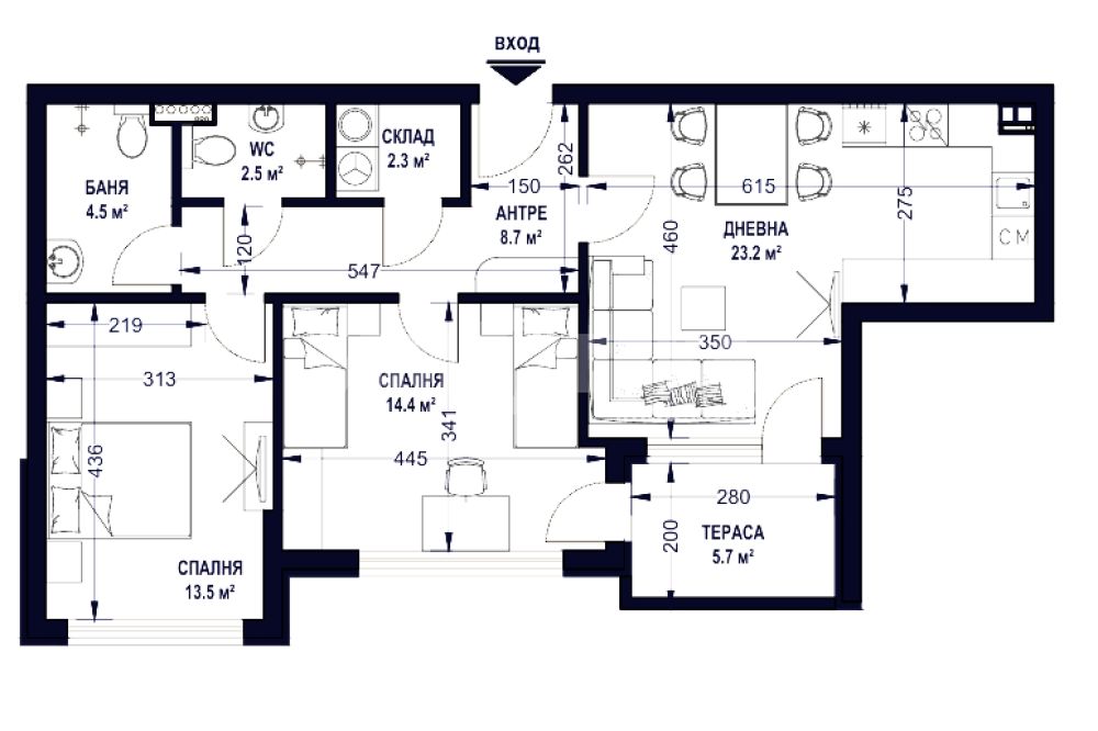 Имотът е със застроена площ от 87м2, разположен на ет.5 в нова сграда с акт 14 и е със следното разпределение: входно антре, всекидневна с кухненски бокс, две спални, две бани, склад и тераса. Изложение: юг. Отопление: ТЕЦ