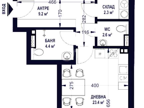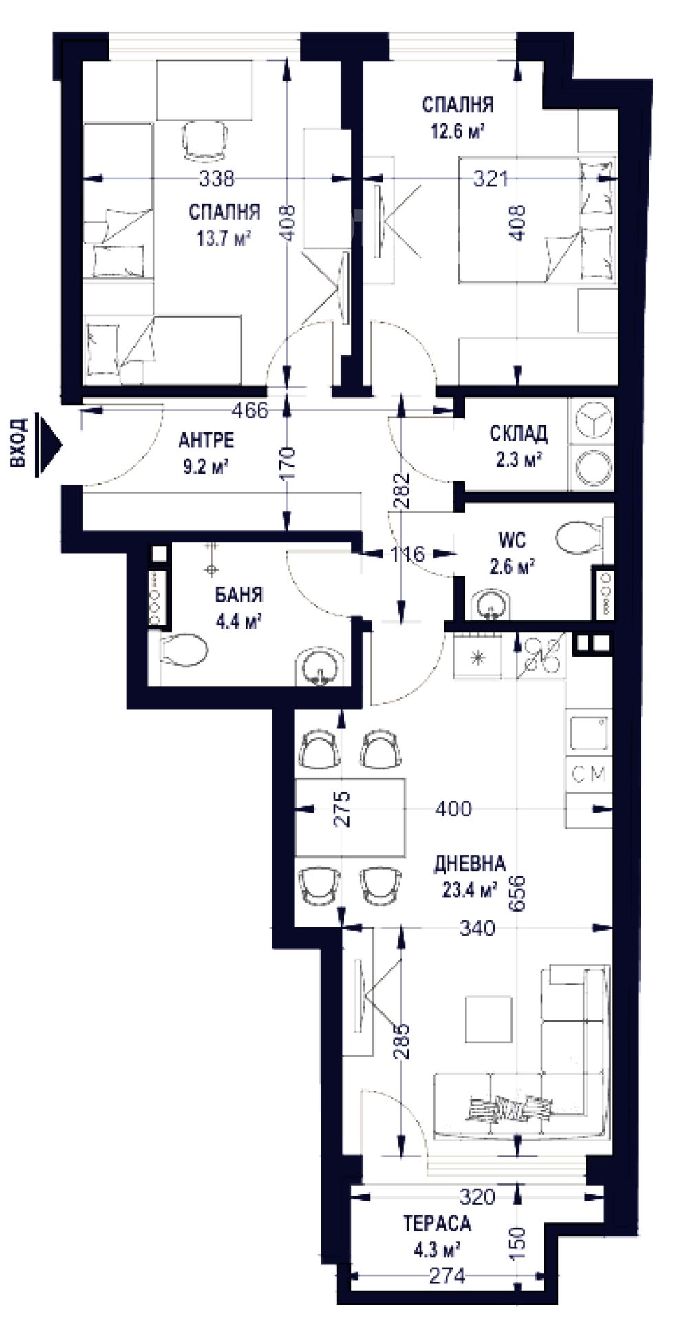 Имотът е със застроена площ от 84.20м2, разположен на ет.3 в нова сграда с акт 14 и е със следното разпределение: входно антре, всекидневна с кухненски бокс, две спални, две бани, склад и тераса. Изложение: юг/север Отопление: ТЕЦ