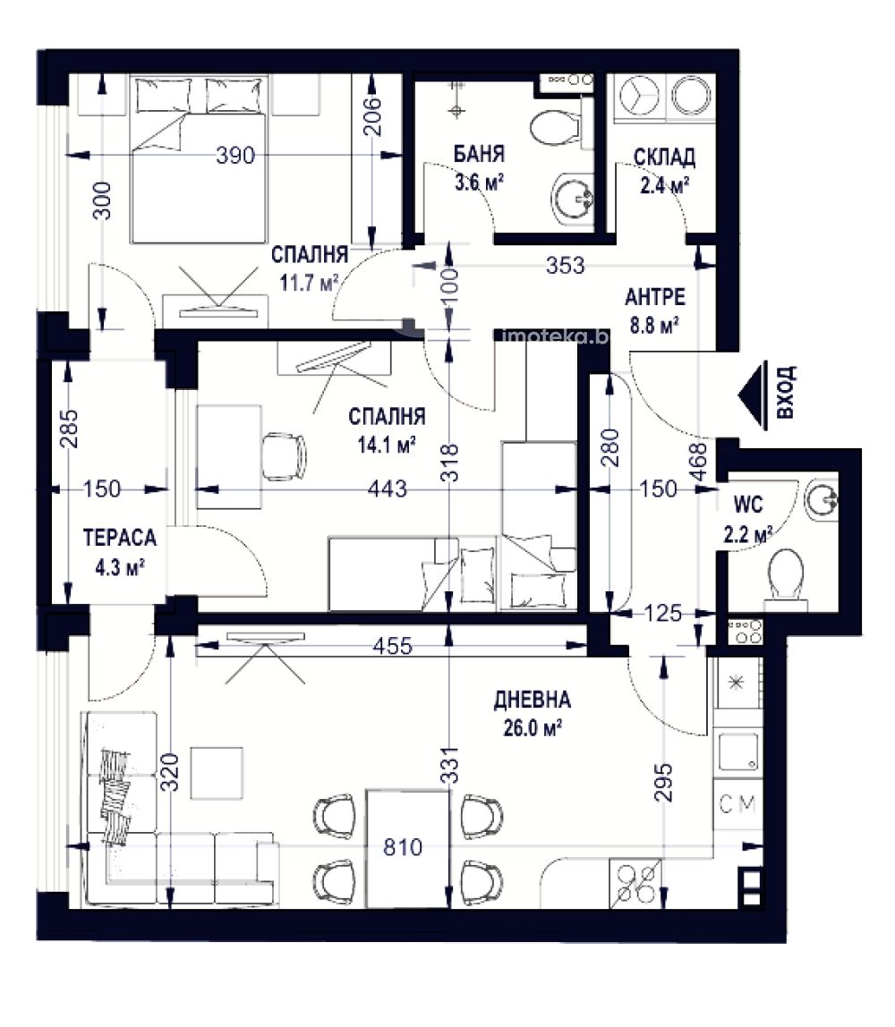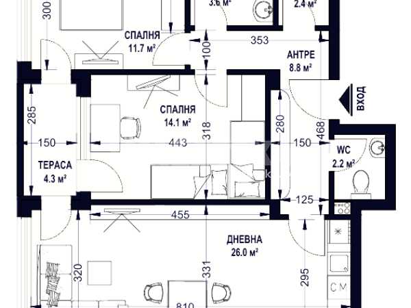 Имотът е със застроена площ от 85м2, разположен на ет.1 в нова сграда с акт 14 и е със следното разпределение: входно антре, всекидневна с кухненски бокс, две спални, баня с тоалетна, самостоятелна тоалетна, склад и тераса.