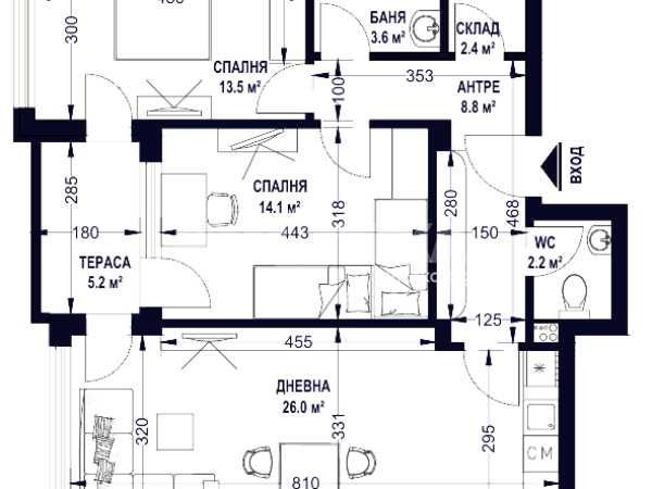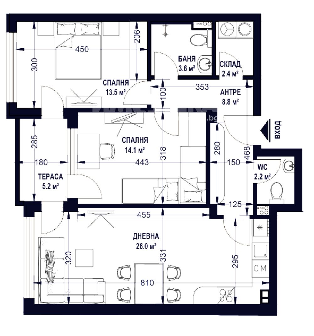 Имотът е със застроена площ от 88м2, разположен на ет.2 в нова сграда с акт 14 и е със следното разпределение: входно антре, всекидневна с кухненски бокс, две спални, баня с тоалетна, самостоятелна тоалетна, склад и тераса.
