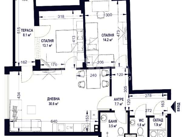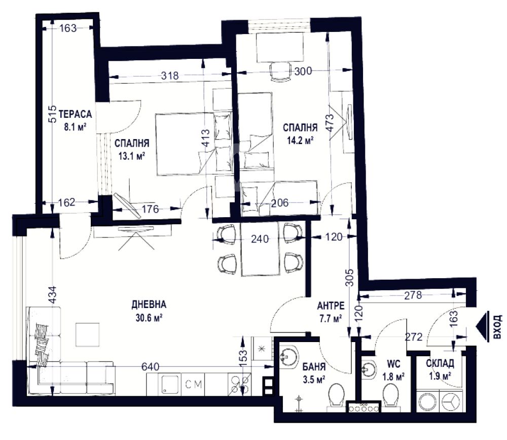 Имотът е със застроена площ от 94м2, разположен на ет.2 в нова сграда с акт 14 и е със следното разпределение: входно антре, всекидневна с кухненски бокс, две спални, баня с тоалетна, самостоятелна тоалетна, склад и тераса.