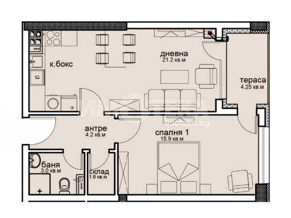 Двустаен апартамент с 58,30 кв.м. застроена площ, състоящ се от: входно антре, всекидневна, спалня, баня, склад и тераса с излаз от всекидневната и спалнята. Югоизточно изложение.