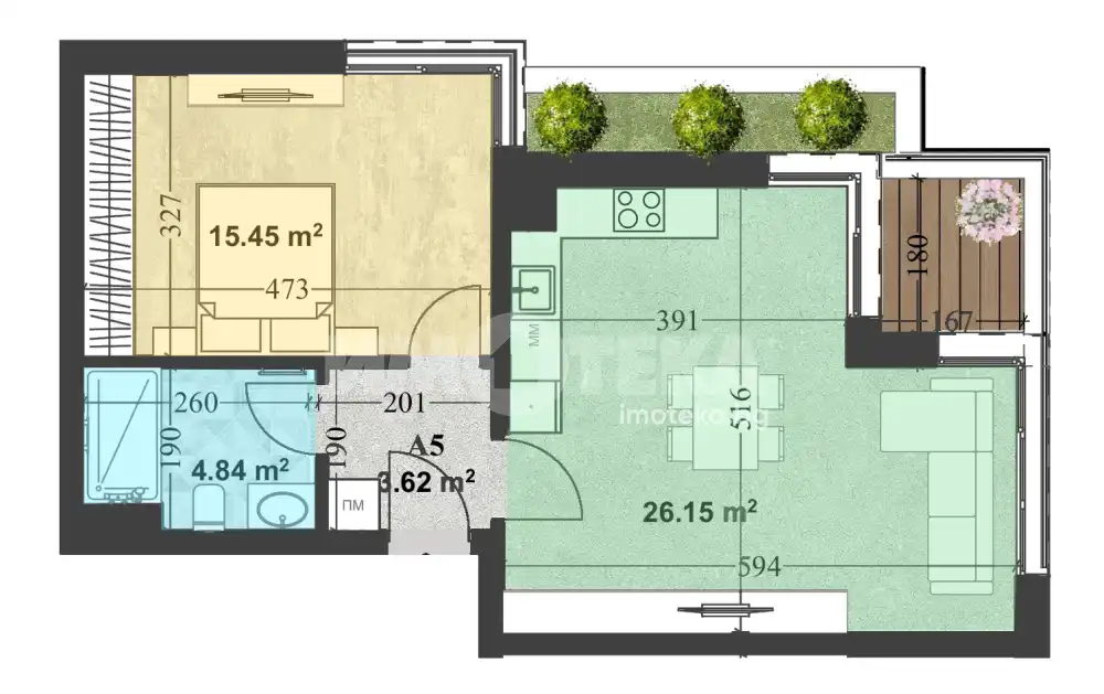 Дневна с кухненска част, комфортна спалня, модерна баня и тераса тип лоджия, която предлага уютно покрито пространство, подходящо за релакс или вечеря на открито.