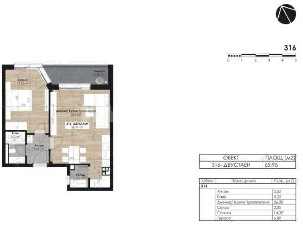 Апартаментът разполага със складово помещение към кухненския бокс и голяма баня с тоалетна.