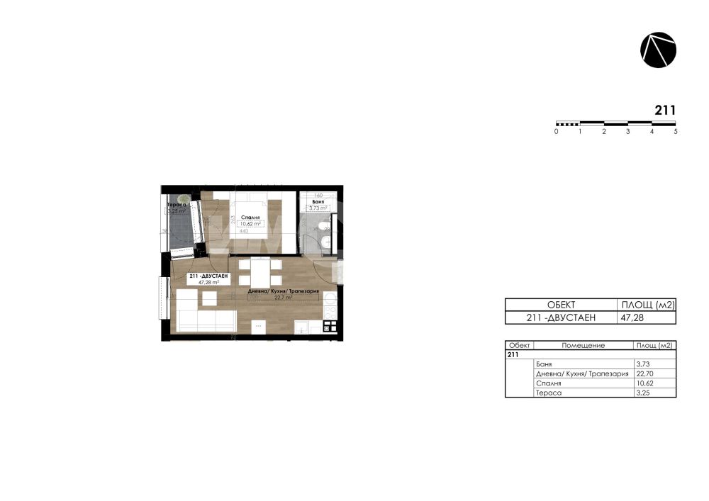 Двустаен апартамент състоящ се от спалня, дневна зона 23кв.м.- кухненски бокс, трапезария и хол, баня с тоалетна, входно антре и тераса.
