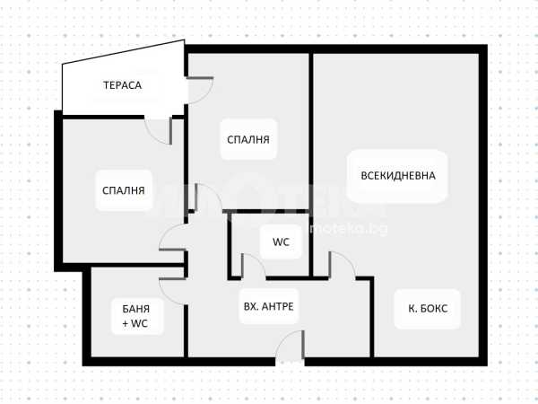 Входно антре, всекидневна с кухненски бокс и трапезария, две непреходни спални, баня с тоалетна, отделна тоалетна и тераса.