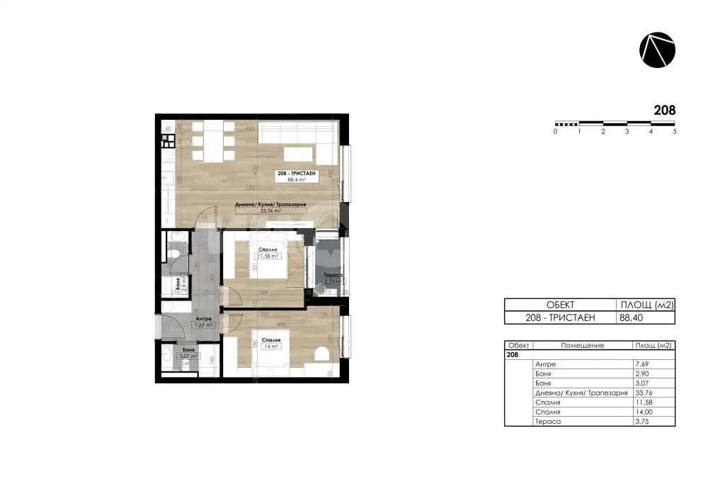 Тристаен апартамент със ЗП 88,40 кв.м. и РЗП 111,87 кв.м. и прилежащ склад № 6. В обявената цена е включена цената на склада. Има три схеми на плащане.