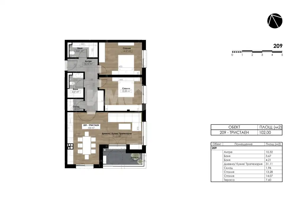 Тристаен апартамент със ЗП 012 кв.м. и РЗП 129,08 кв.м.. В обявената цена е включена цената на прилежащия склад. Три схеми на плащане.