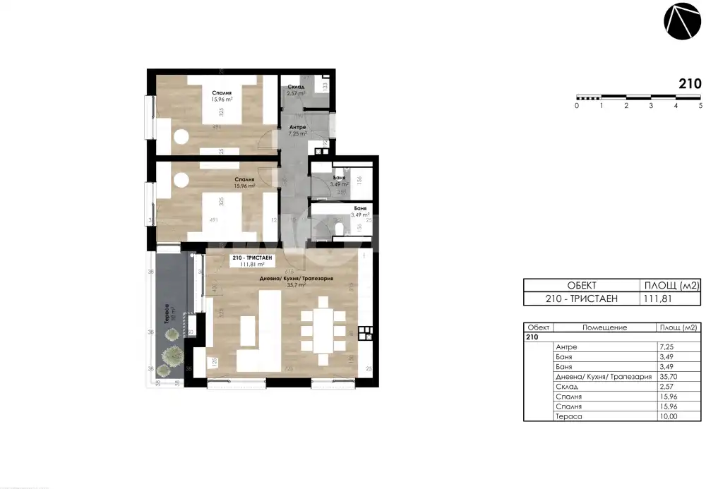 Тристаен апартамент със ЗП 11,81 кв.м. и РЗП 141,49 кв.м.. Просторни спални по 15 кв.м., дневна с площ 35 кв.м. и голяма и хубава тераса. В обявената цена е включена цената на прилежащия склад.Този апартамент може да стане на четиристаен с РЗП 159 кв.м. както е показано на втората скица и цената не се отнася за този вариант.