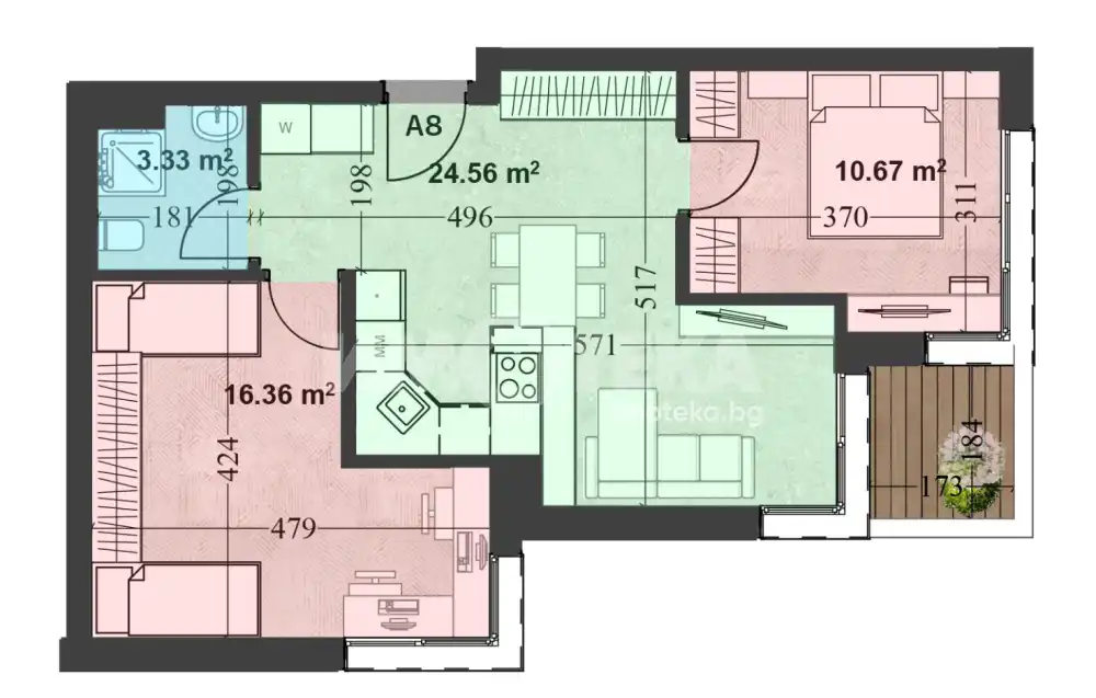 Дневна с кухненски бокс, две спални, модерна баня и тераса тип лоджия, която предлага уютно покрито пространство, подходящо за релакс или вечеря на открито.
