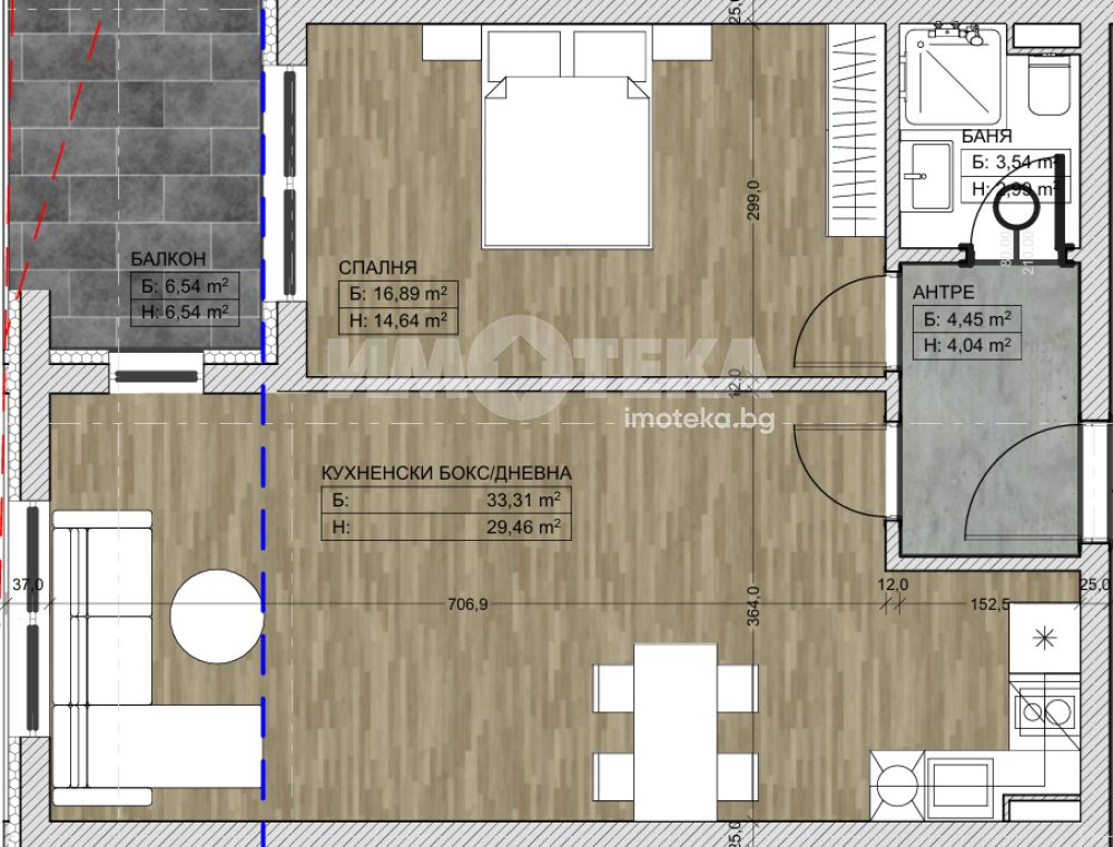 Двустаен апартамент, който се състои от дневна, спалня, бяня и склад. Към апартамента има задължителна покупка на външно паркомясто.