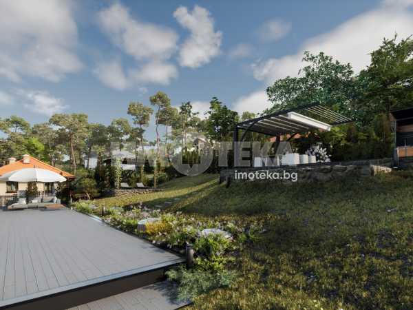 ЕКСКЛУЗИВНА къща до Ботаническата градина, в.з.Киноцентъра-Драгалевци, РЗП= 505 м2 надземно и самостоятелен двор 884м2. Изпълнена до кота 0.00, с укрепване на терена. Завършване - лято 2026 г. Пространствата развити на три нива: първи етаж с гаражи, СПА и технически помещения, основно ниво - богата дневна с трапезария и кухня, излизане към двор с прекрасна гледка към Витоша и града, второ надземно ниво с четири спални. Самостоятелен кондо апартамент на първия етаж.