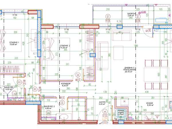 Тристаен апартамент на етаж втори/ първи над партер със ЗП-100м2-РЗП-115,24м2. Дневна с кухненски бокс и трапезария-35,6м2, две просторни спални, две бани, място за термопомпа и балкон. Изложение С/И. налични ПМ и гаражи.