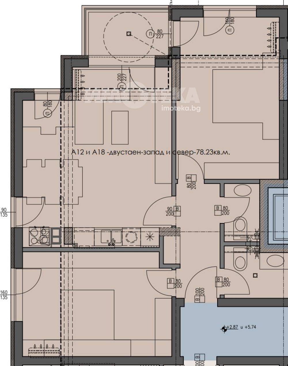 Тристаен апартамент с изложение Запад/ Север, състоящ се от антре, баня с тоалетна и отделна тоалетна, две спални, дневна с кухненски бокс с излаз на тераса.