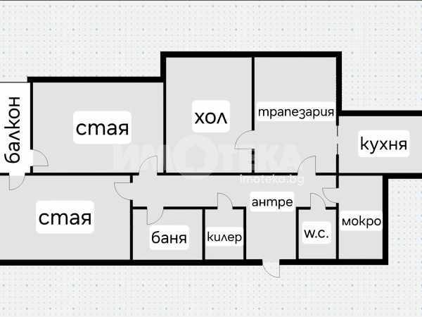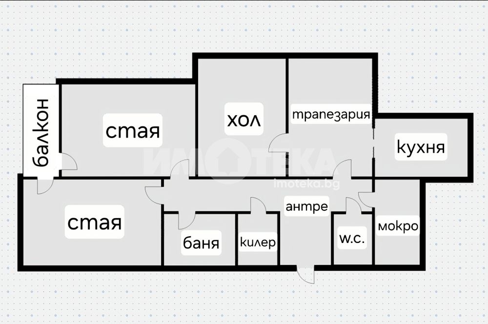 Тристаен апартамент със застроена площ от 123кв.м, разпределени в коридор/антре, две спални, дневна с трапезария, просторна кухня, баня с тоалетна, отделна тоалетна, складово помещение и мокро помешение. Жилището е светло на 2 етаж над партер.