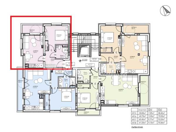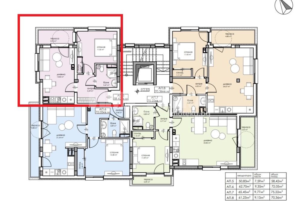 Двустаен апартамент с площ 75,22 кв. м., етаж 2 от 4, асансьор. Състои се от антре, дневна с кухненски кът и спалня с обща тераса за двете поомещения, баня с тоалетна и складово помещение.