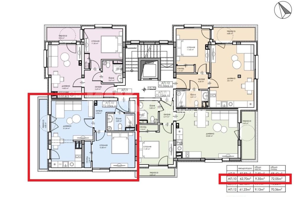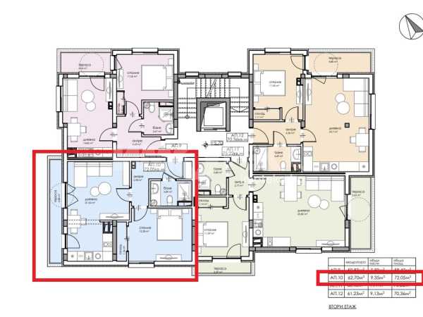 Двустаен апартамент с площ 72,05 кв. м., етаж 3 от 4, асансьор. Състои се от антре, дневна с кухненски кът с тераса, спалня, баня с тоалетна и складово помещение.