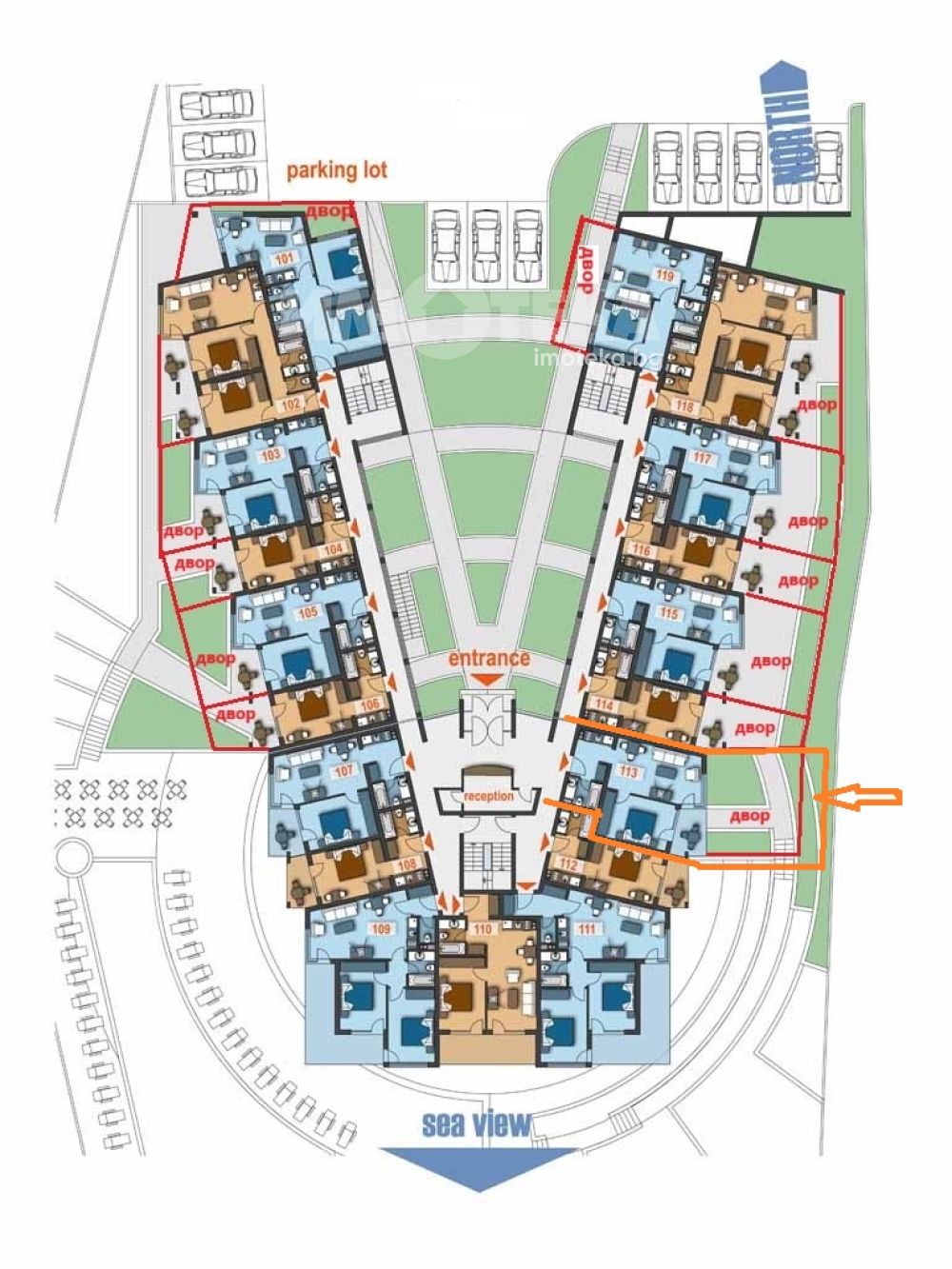 Двустаен апартамент в новострояща се жилищна сграда в гр. Свети Влас. Имотът е с площ 63,90 кв. м, първи етаж. Към имота има има двор. Състои се от дневна с кухненски кът, спалня, от двете помещения се излиза на тераса - двор, баня и тоалетна.