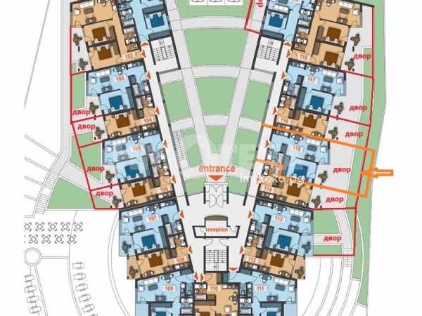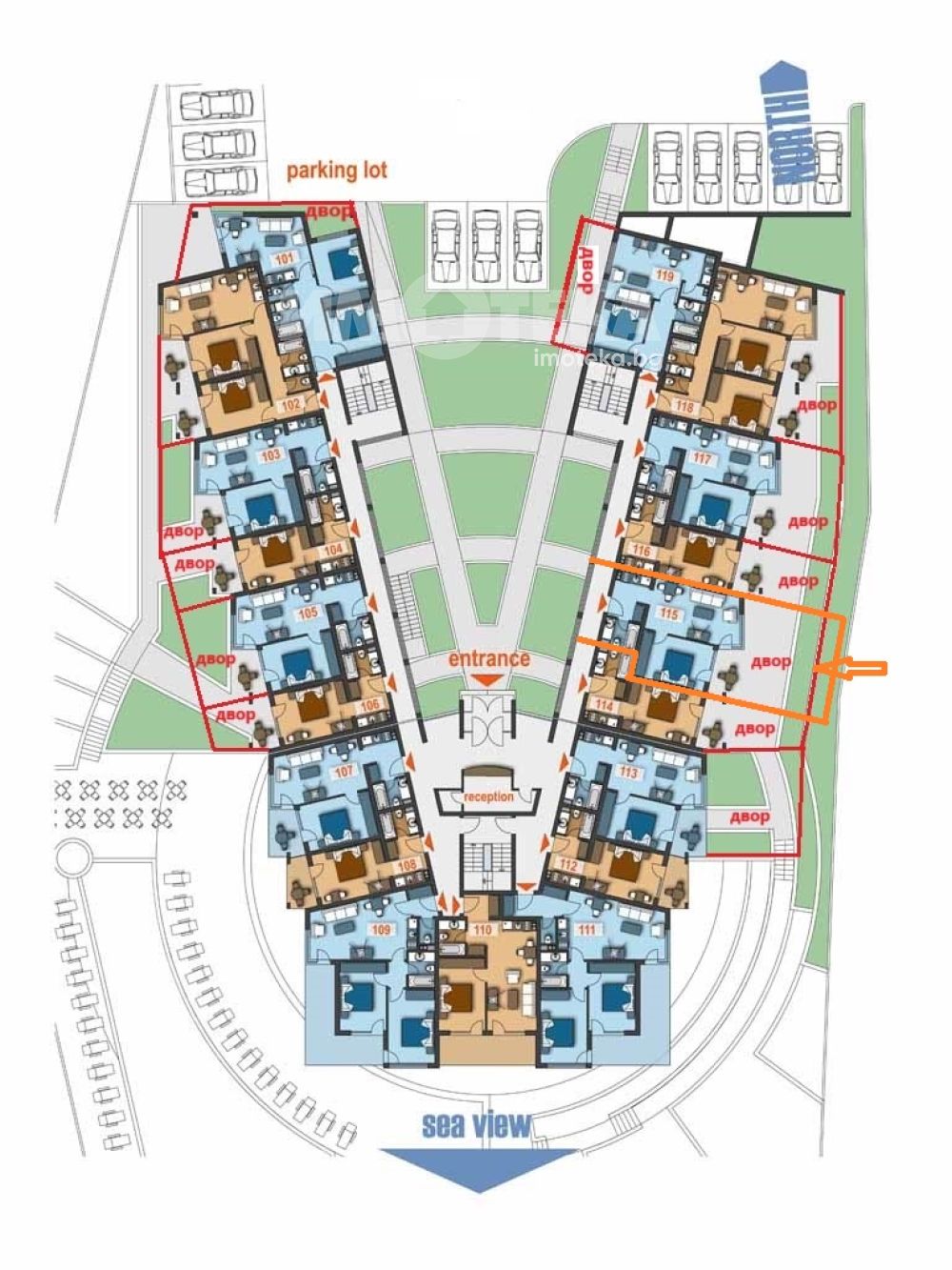 Двустаен апартамент в новострояща се жилищна сграда в гр. Свети Влас. Имотът е с площ 57,11 кв. м, първи етаж. Към имота има има двор. Състои се от дневна с кухненски кът, спалня, от двете помещения се излиза на тераса - двор, баня и тоалетна.