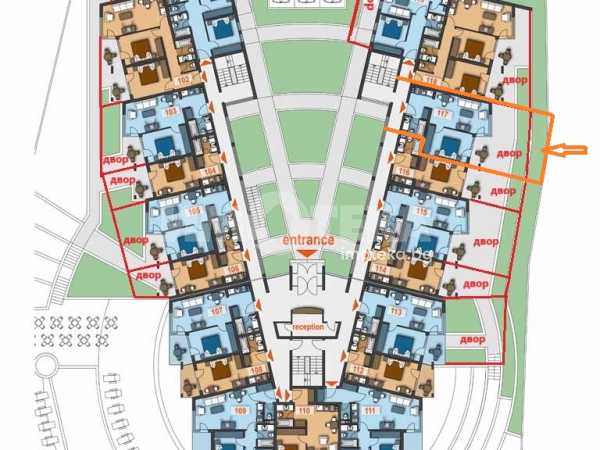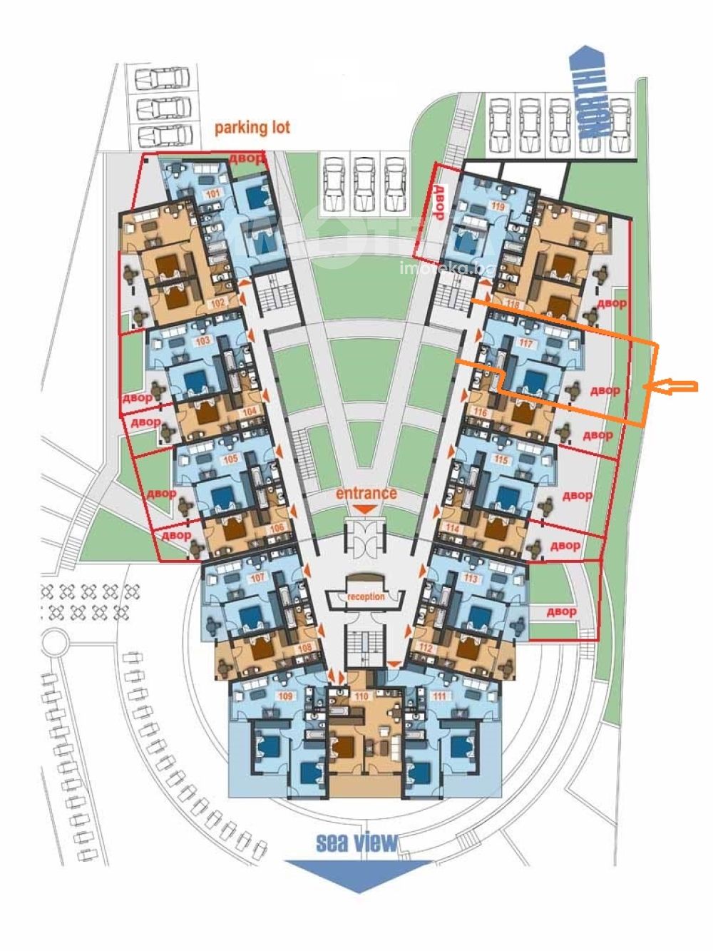 Двустаен апартамент в новострояща се жилищна сграда в гр. Свети Влас. Имотът е с площ 57,11 кв. м, първи етаж. Към имота има има двор. Състои се от дневна с кухненски кът, спалня, от двете помещения се излиза на тераса - двор, баня и тоалетна.