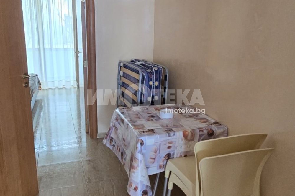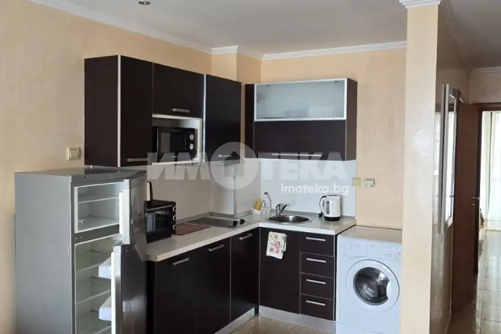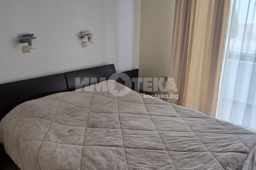 Двустаен апартамент във ВИП комплекс в Свети Влас, обзаведен и оборудван, площ от 64 кв.м, гледка море.. Имотът е с функционално разпределение, което осигурява максимален комфорт. Състои се от коридор, дневна с кухненски бокс, спалня, баня с тоалетна, две тераси. Комплексът е от затворен тип. Такса поддръжка 700 евро годишно.