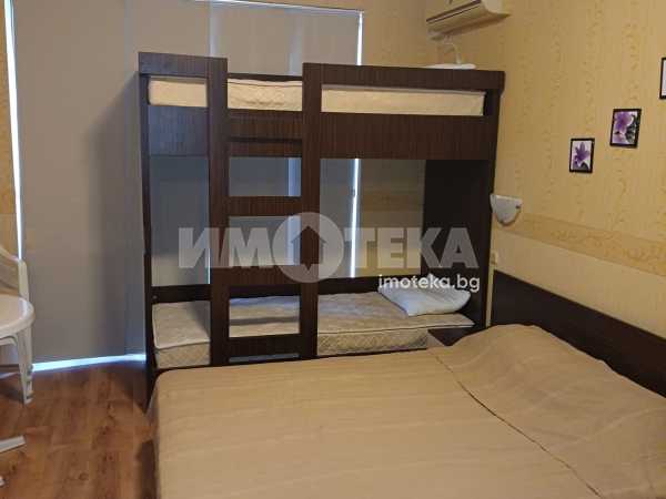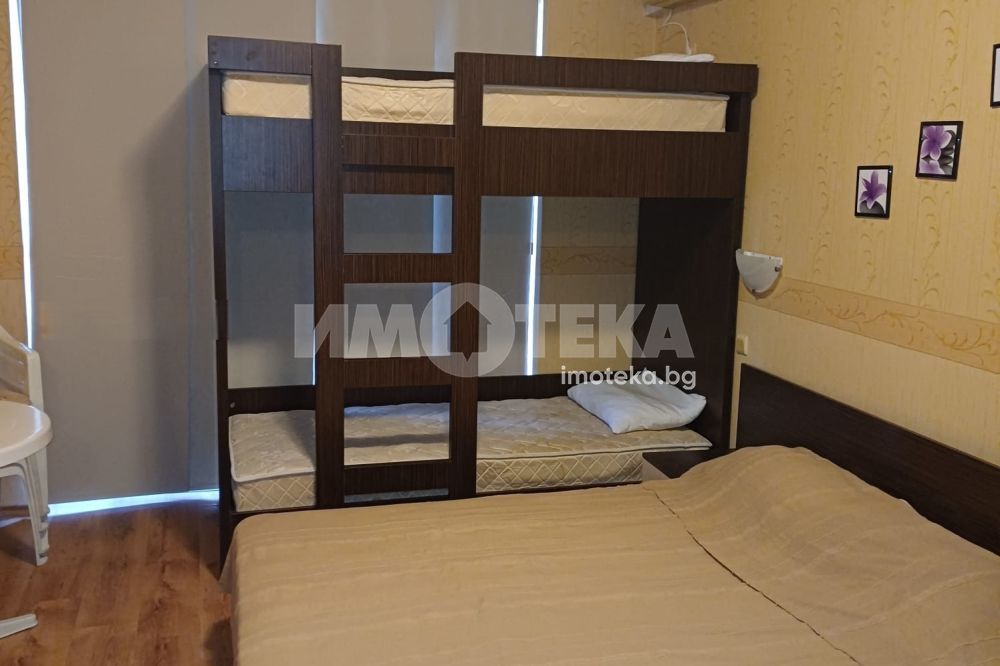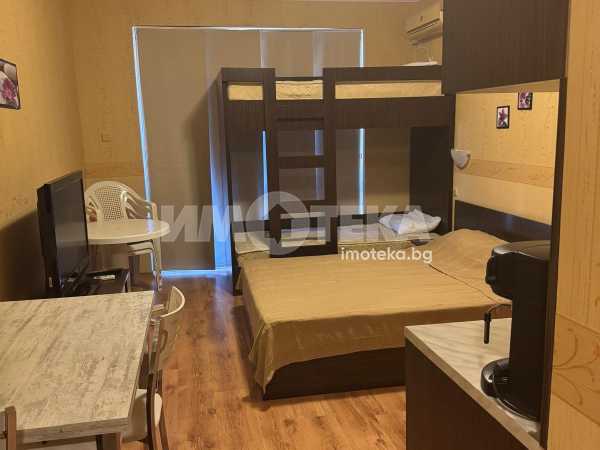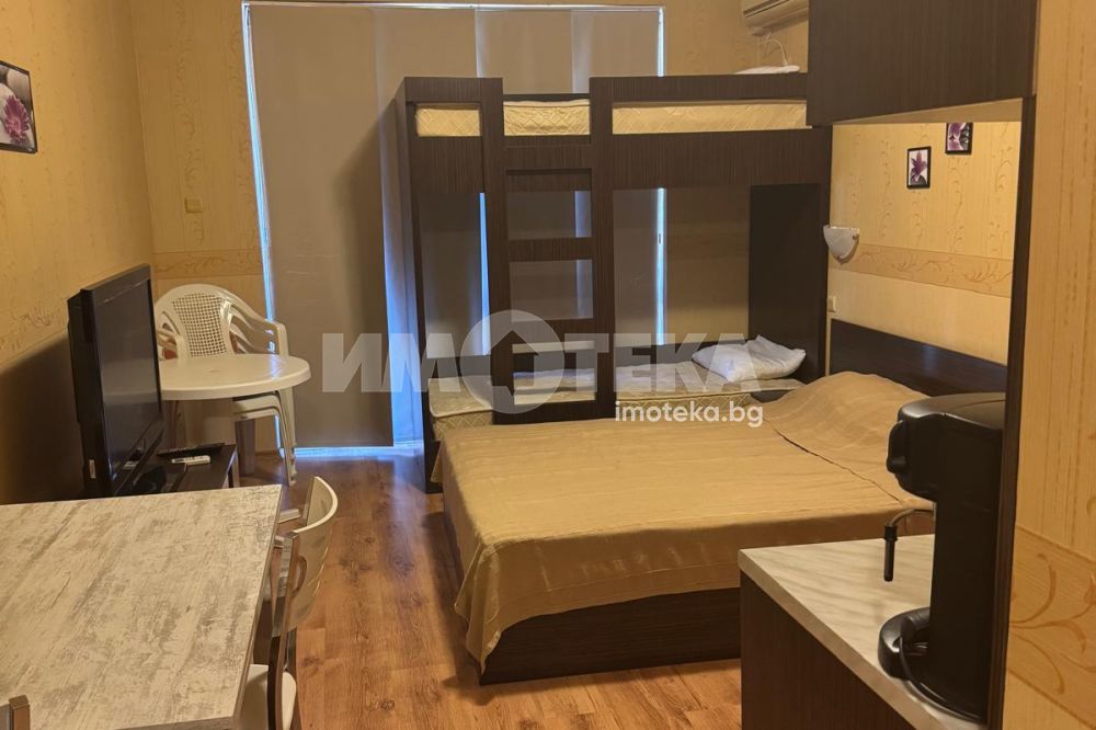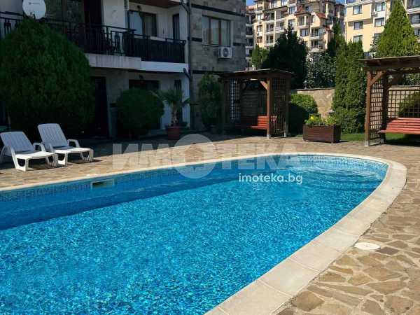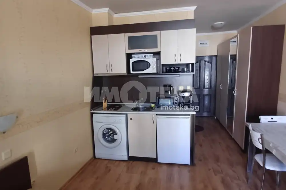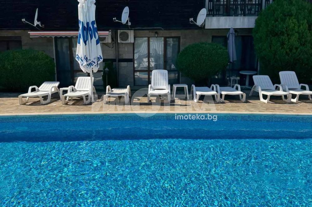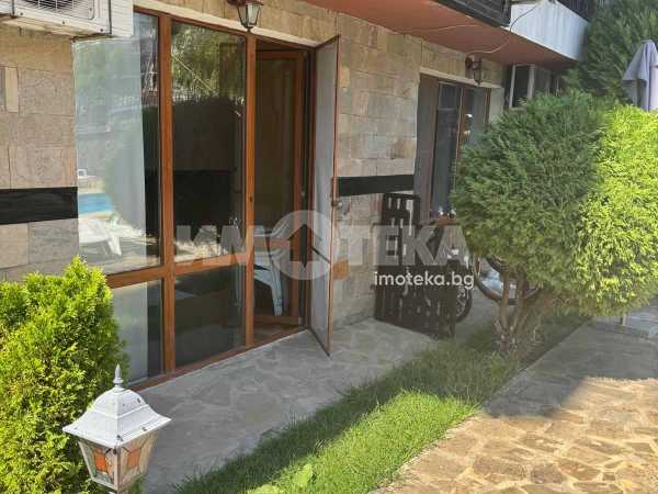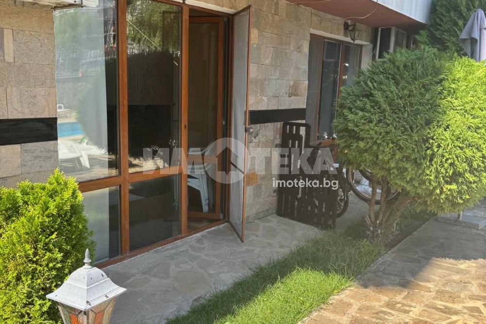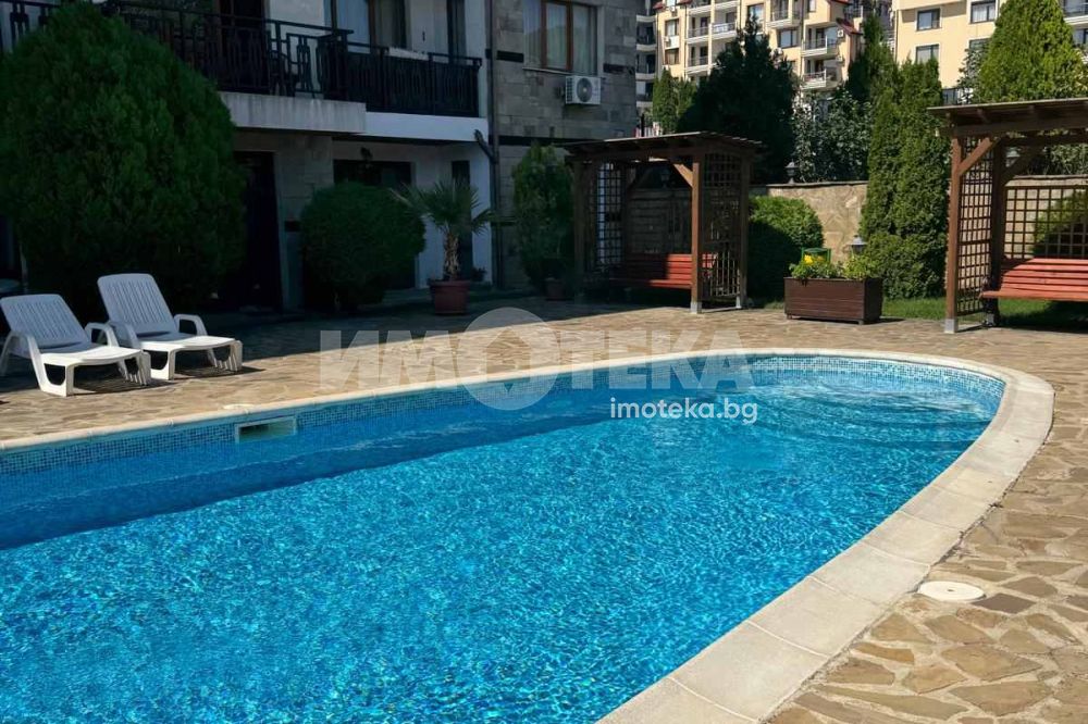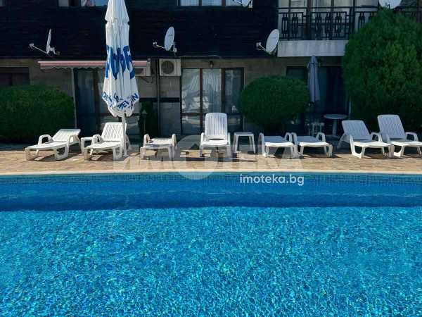 Едностаен апартамент в центъра на Свети Влас. Площ на имота 42 кв. м., етаж 1 /партер/. Състои се от коридор, дневна с кухненски бокс, кът с двойна спалня и отделно двуетажно легло, гардероб, маса със столове, баня и тоалетна. Директен достъп до басейн. Таксата 300 евро на година.