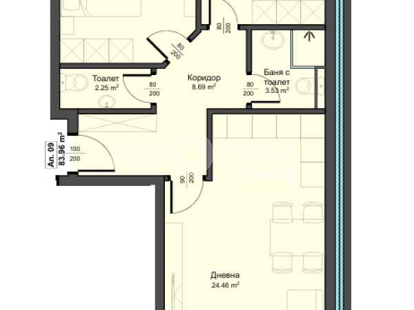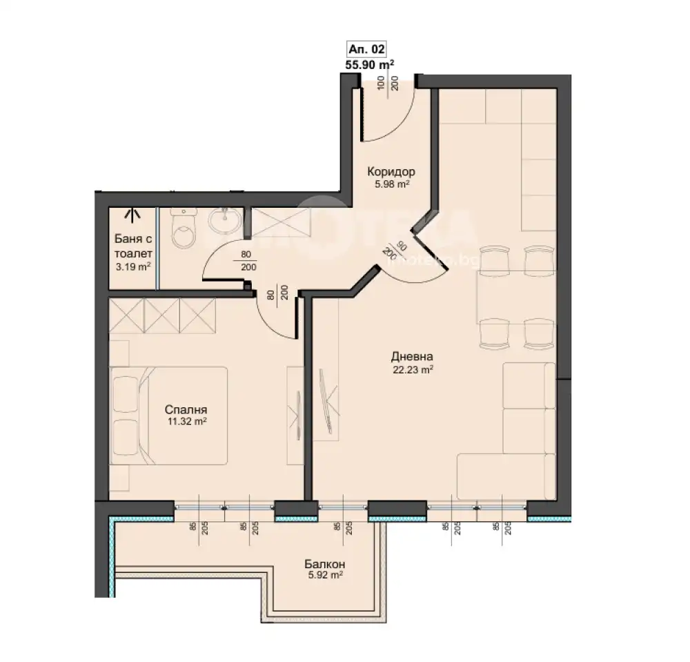 Жилището разполага с площ от 59 кв.м. разпределена в коридор, дневен тракт с кухненски бокс, спалня, балкон, баня и тоалетна.