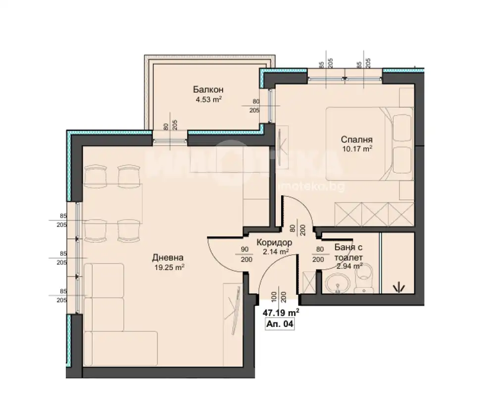 Жилището разполага с площ от 50 кв.м. разпределена в коридор, дневен тракт с кухненски бокс, спалня, балкон, баня и тоалетна.