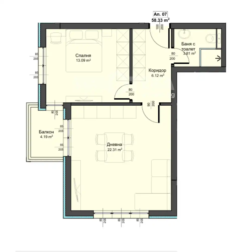 Жилището разполага с площ от 62 кв.м. разпределена в коридор, дневен тракт с кухненски бокс, спалня, балкон, баня и тоалетна.
