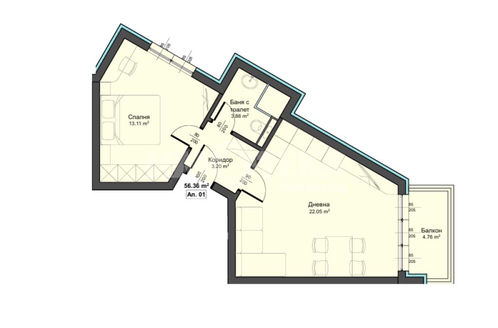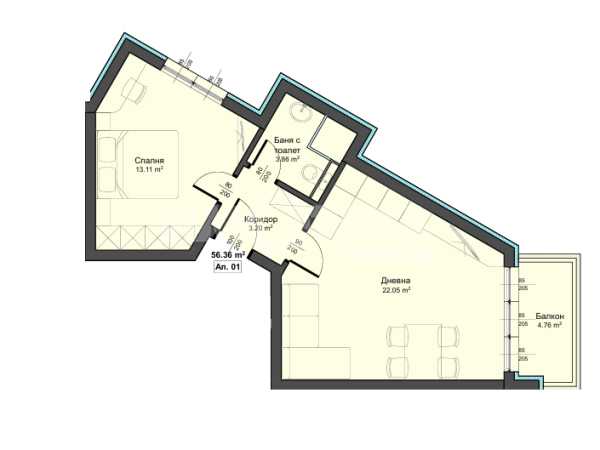 Жилището разполага с площ от 60 кв.м. разпределена в коридор, дневен тракт с кухненски бокс, спалня, балкон, баня и тоалетна.