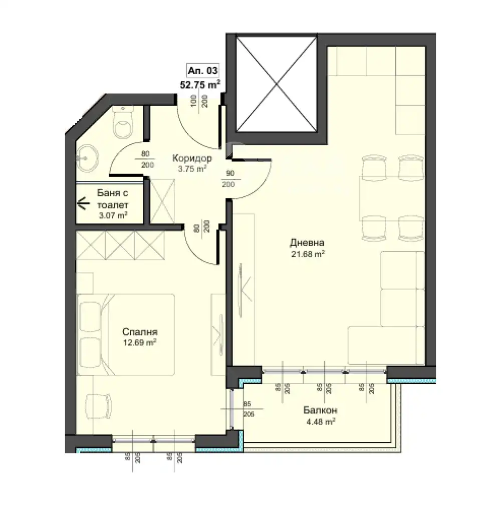 Жилището разполага с площ от 56 кв.м. разпределена в коридор, дневен тракт с кухненски бокс, спалня, балкон, баня и тоалетна.