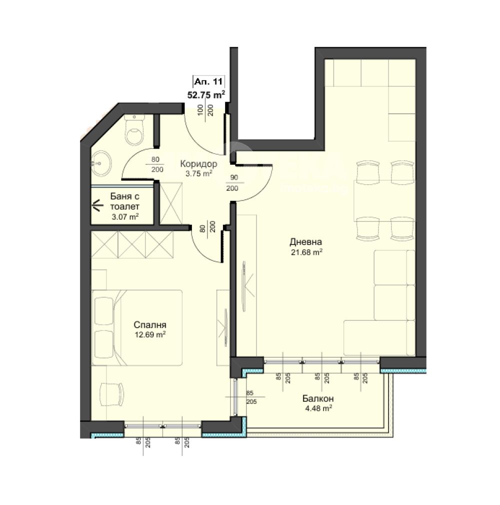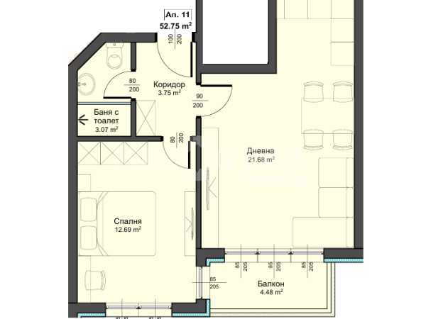 Жилището разполага с площ от 56 кв.м. разпределена в коридор, дневен тракт с кухненски бокс, спалня, балкон, баня и тоалетна.