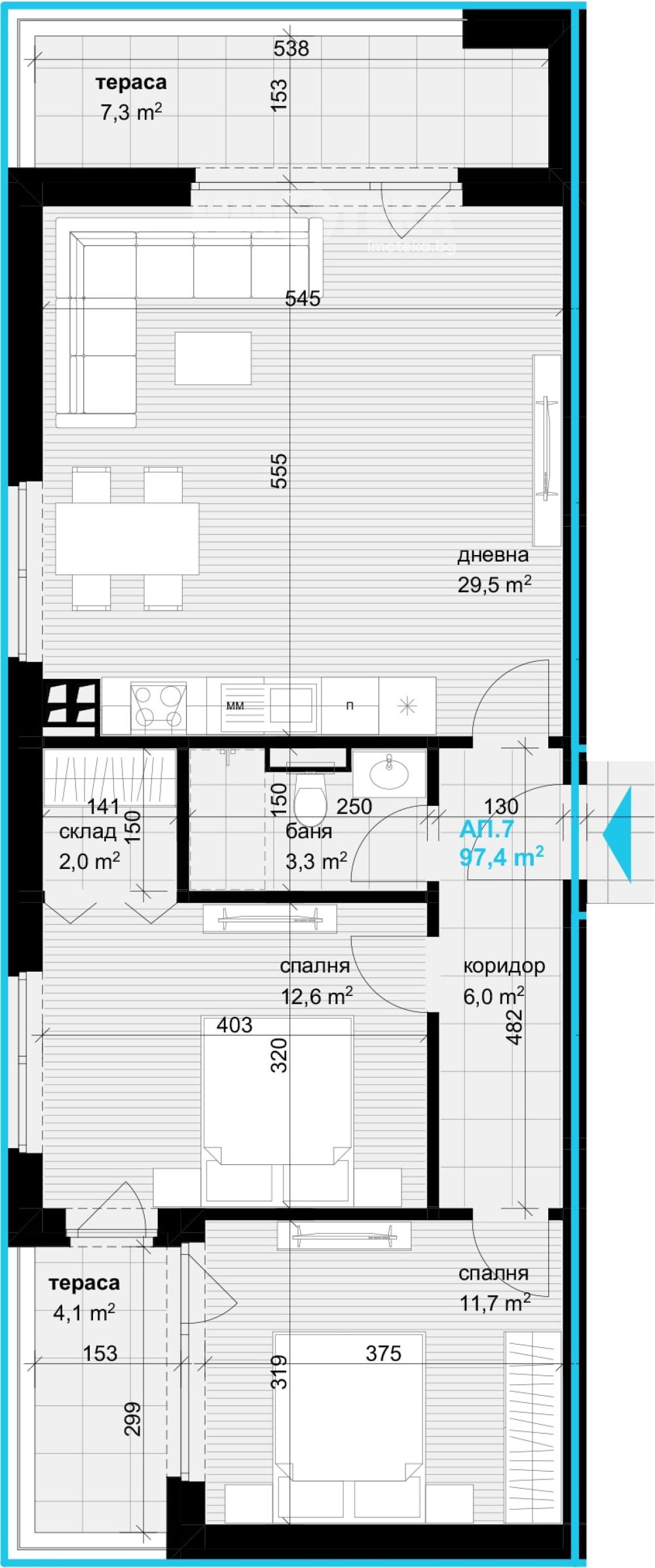 Продава се тристаен апартамент в затровен комплекс "Елисия Грийн" кв.Аспарухово . Имотът се намира на 2-ри етаж и е с площ от 113м2 , които са разпределение по следният начин: Всекидневна с кухня, Две Спалня , една от , които с килер (дрешник), Общ санитарен възел и Две тераси +изба .