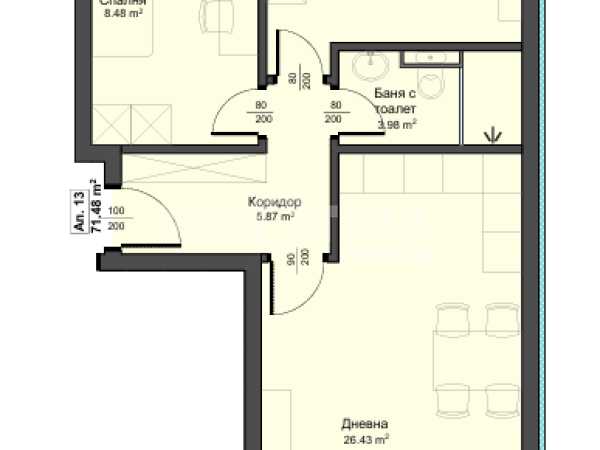 Жилището разполага с площ от 77 кв.м. разпределена в коридор, дневен тракт с кухненски бокс, две спални, балкон, баня и тоалетна.
