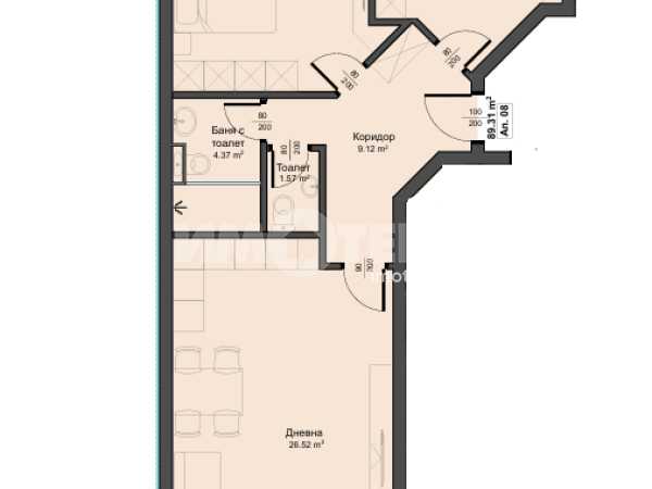 Жилището разполага с площ от 98 кв.м. разпределена в коридор, дневен тракт с кухненски бокс, две спални, балкон, баня и тоалетна, и втори санитарен възел.