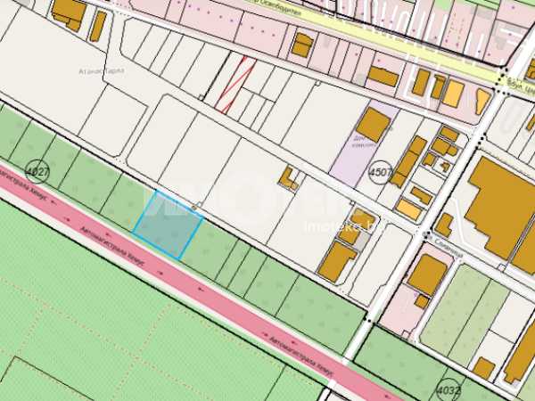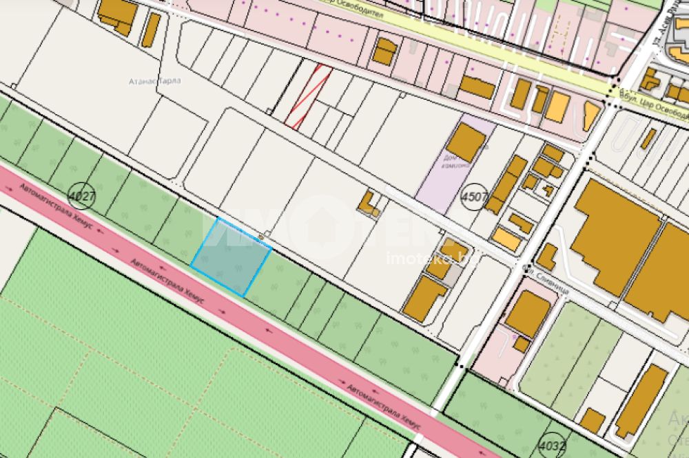 Прав и равен парцел с лице на магистралата. С ПУП за обществено обслужващи дейности – търговски комплекс, шоурум, склад и др. Параметри на застрояване: 30 % плътност, кинт 1,2, озеленяване 50 %, височина без ограничение.