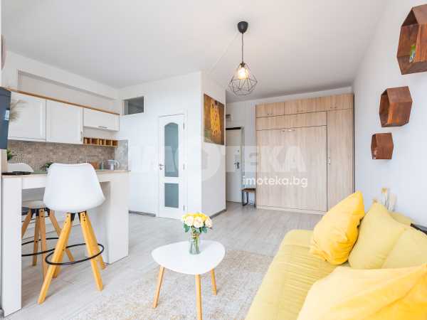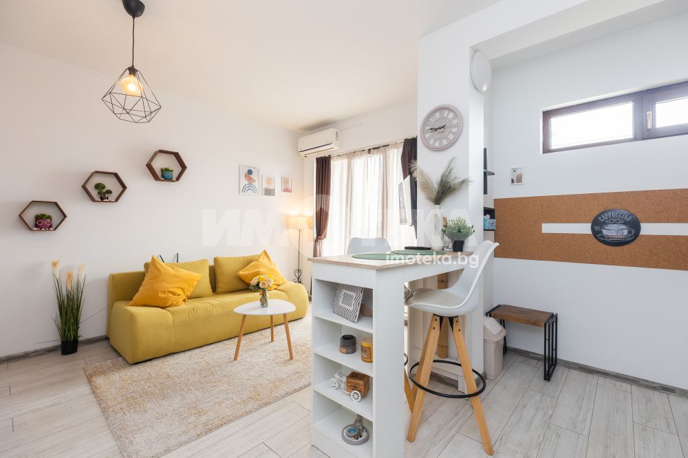 Състои се от входно антре, една голяма стая с кухненски бокс, санитарно помещение и панорамна тераса. От имота се открива прекрасна морска гледка.