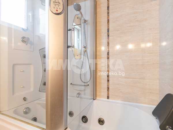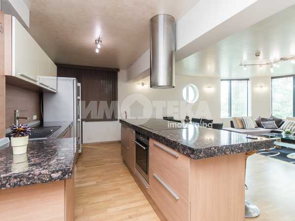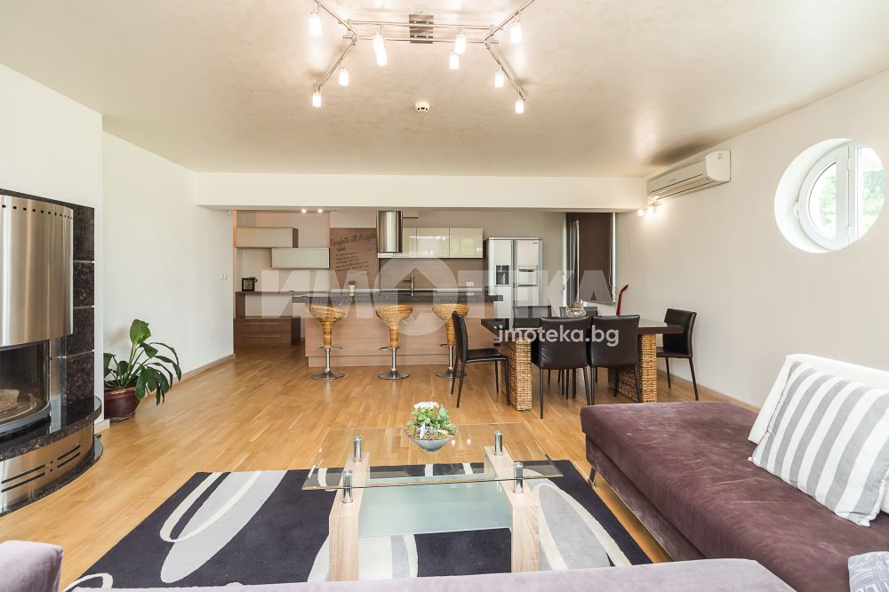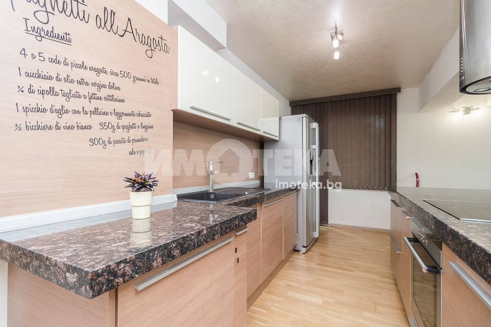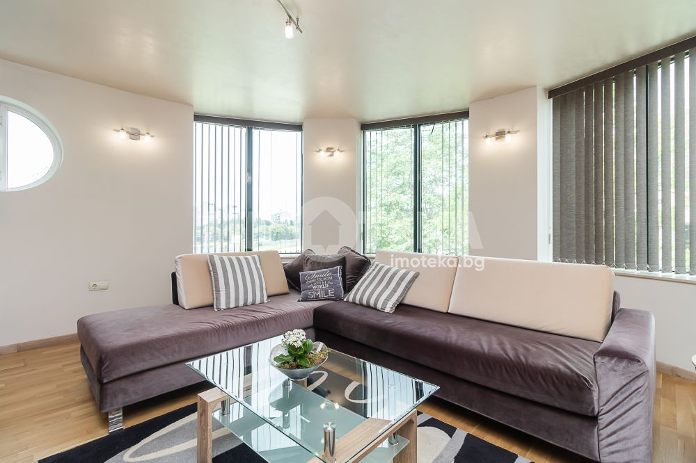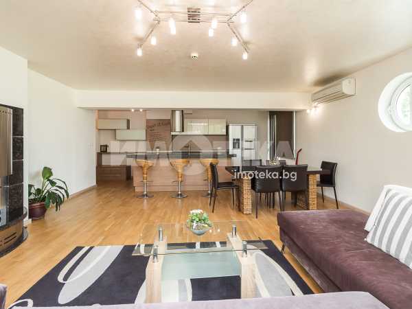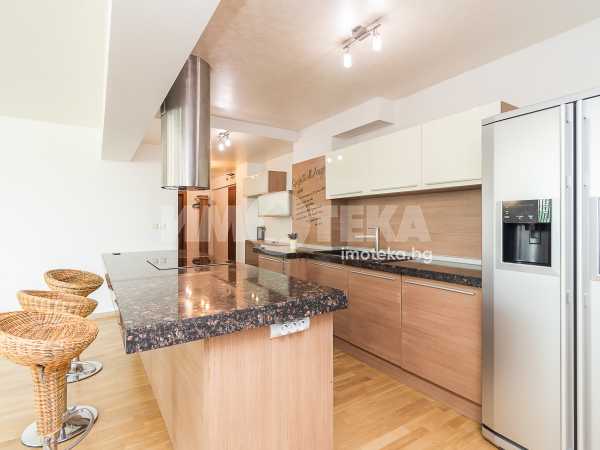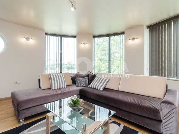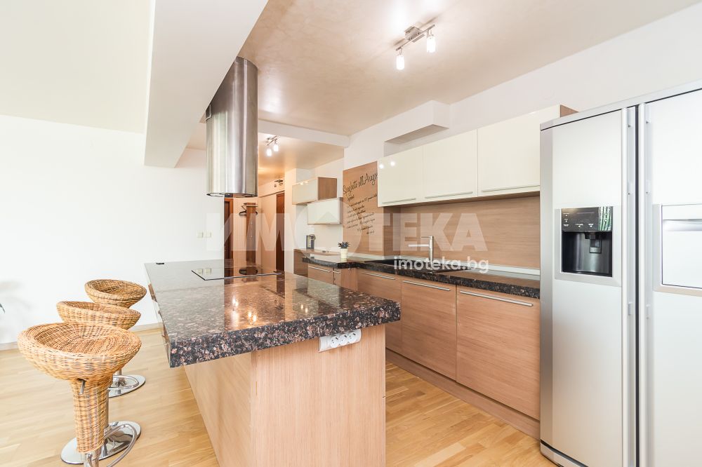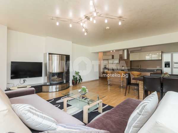 Дизайнерски обзаведен тристаен апартамент, ново строителство. Състои се от просторна дневна /около 50кв. м/ с мека мебел, холна масичка; модерна вградена кухня, оборудвана с бяла техника /вкл.съдомиялна машина/, маса за хранене; две спални със санитарни възли към всяка от тях; две тераси.