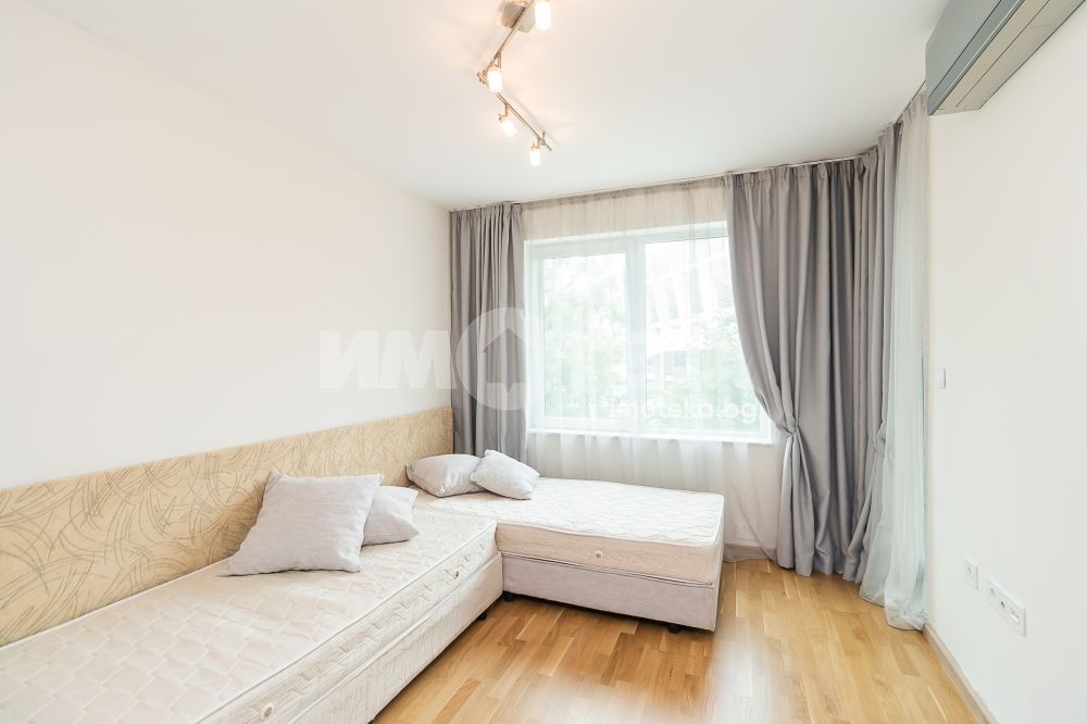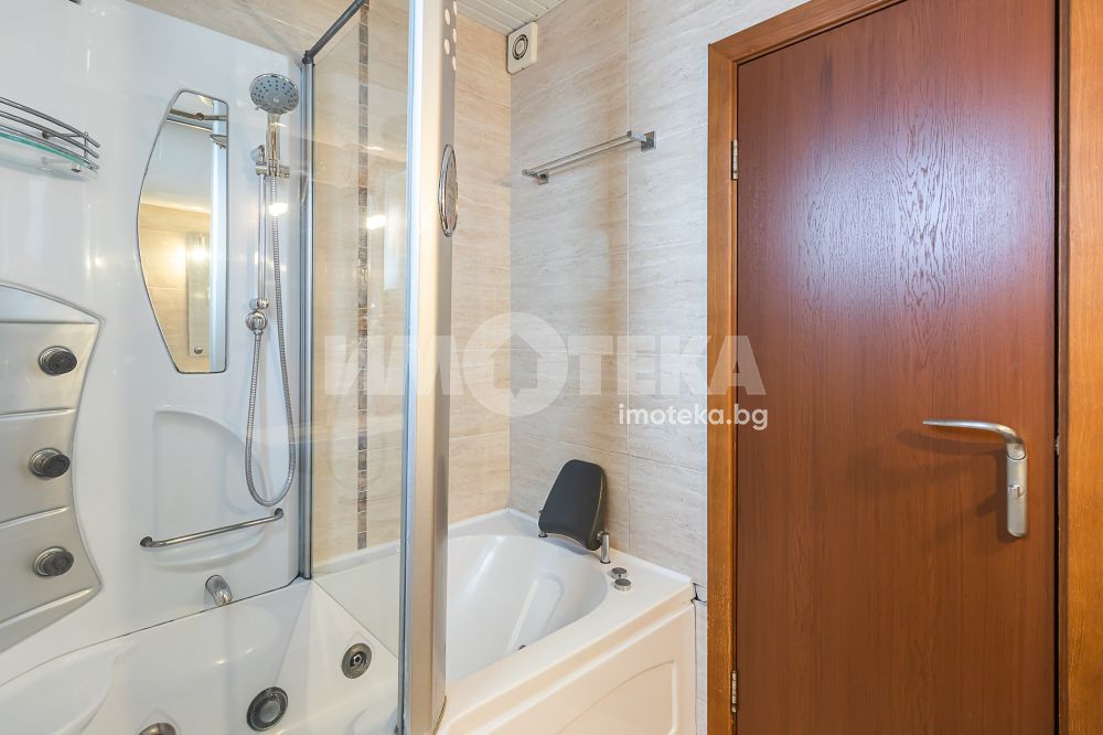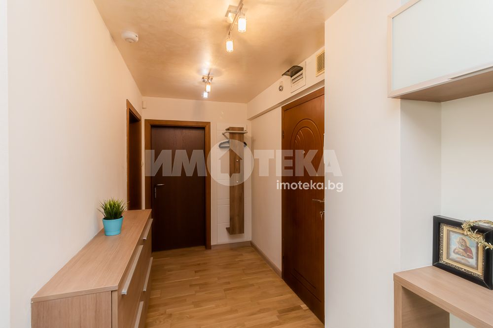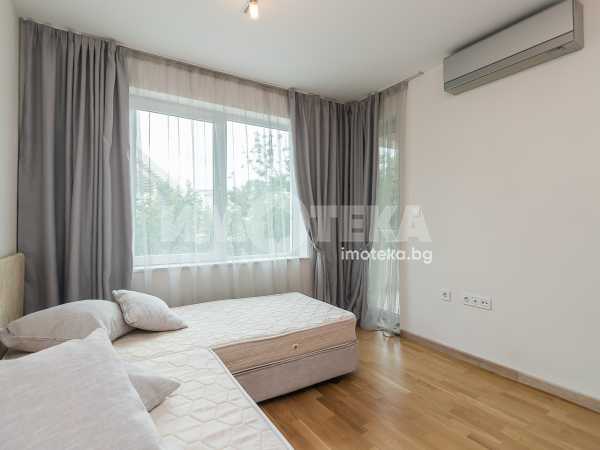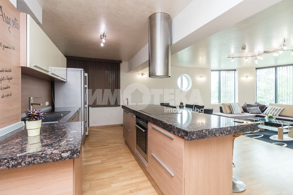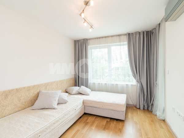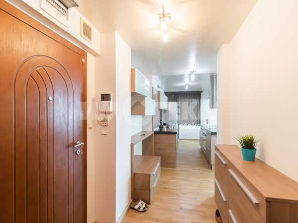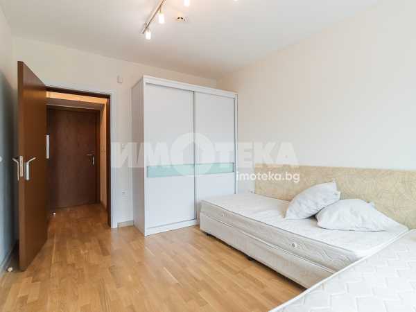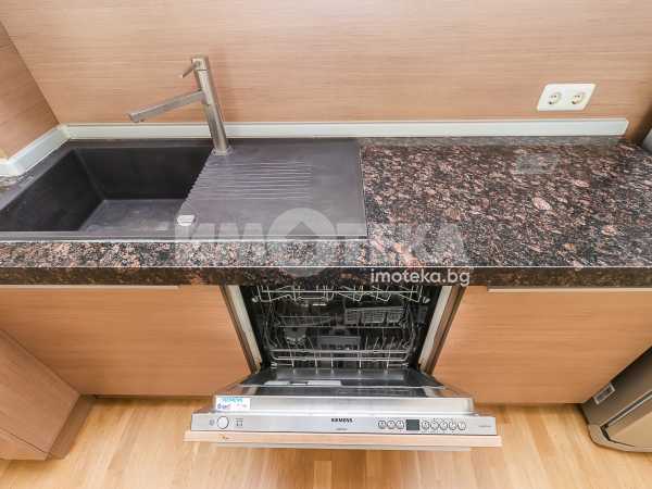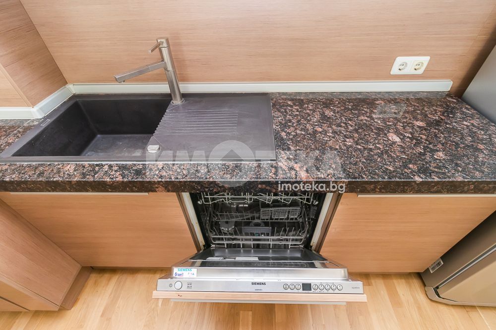 Дизайнерски обзаведен тристаен апартамент, ново строителство. Състои се от просторна дневна /около 50кв. м/ с мека мебел, холна масичка; модерна вградена кухня, оборудвана с бяла техника /вкл.съдомиялна машина/, маса за хранене; две спални със санитарни възли към всяка от тях; две тераси.