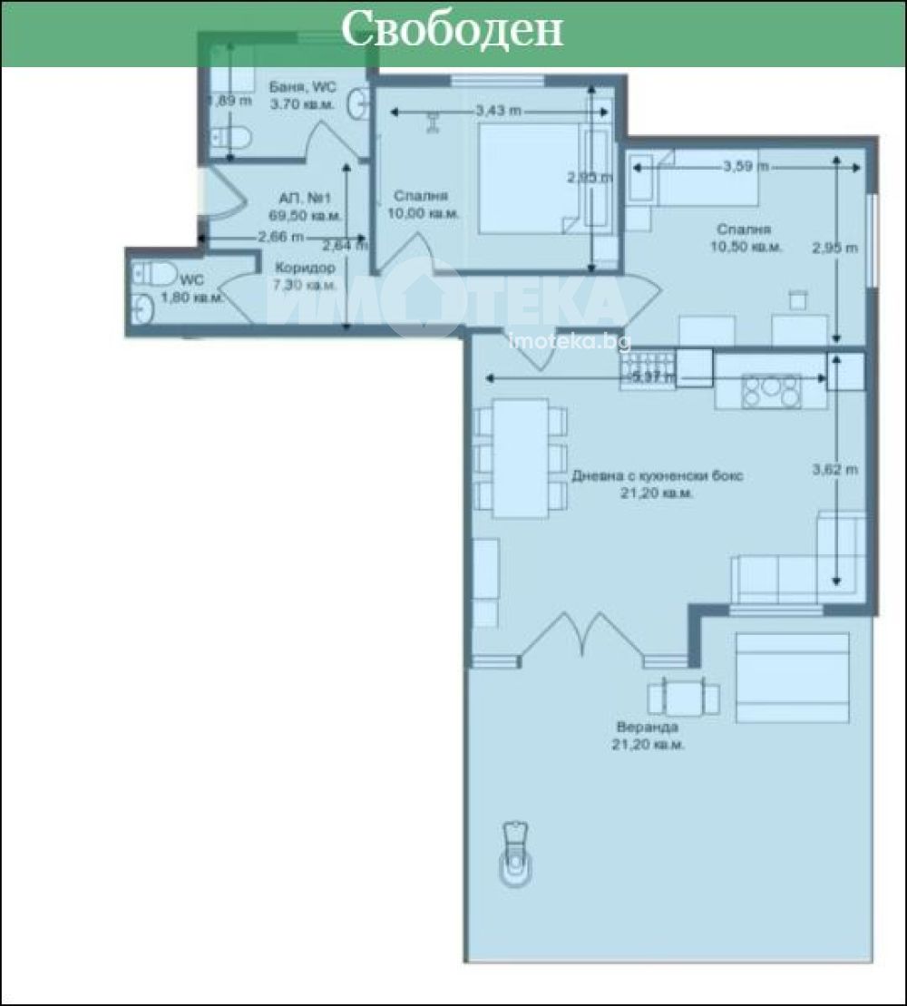 Удобен тристаен апартамент, находящ се на първи партерен етаж на сградата и разпределен както следва: Дневна с кухненскки бокс, две спални, баня, тоалет, голяма веранда тип лятна градина пред дневната, с достъп само от нея.