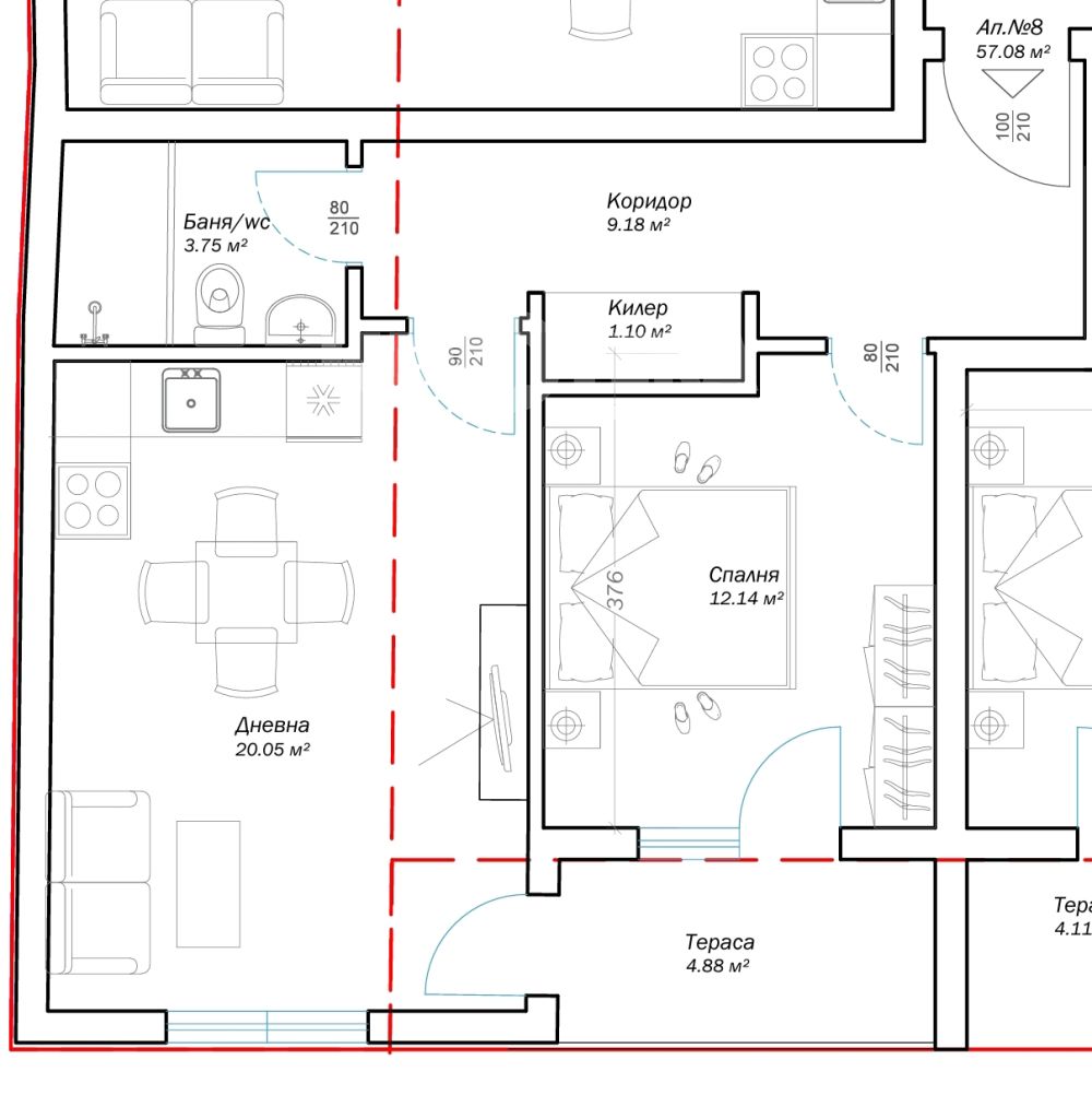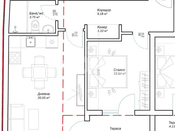 Състои се от хубава дневна, спалня с добри размери, баня-тоалет, килер и коридор.